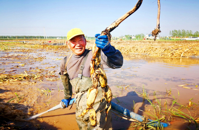 4月17日,建安區(qū)蔣李集鎮(zhèn)金營(yíng)村藕塘,村民張來(lái)法在展示剛剛挖出的蓮藕。近年來(lái),該村大力發(fā)展特色種植,村民有了實(shí)實(shí)在在的獲得感和幸福感。這個(gè)藕塘共占地22畝,為該村村民宋軍召所有?!俺ジ鞣N費(fèi)用外,每畝可收入七八千元。今年俺這藕豐收了,歡迎大家來(lái)吃!”宋軍召說(shuō)。 記者 孫學(xué)濤 攝