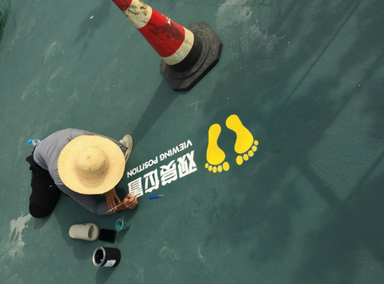 施工人員繪制“觀賞位置”提示標(biāo)志。