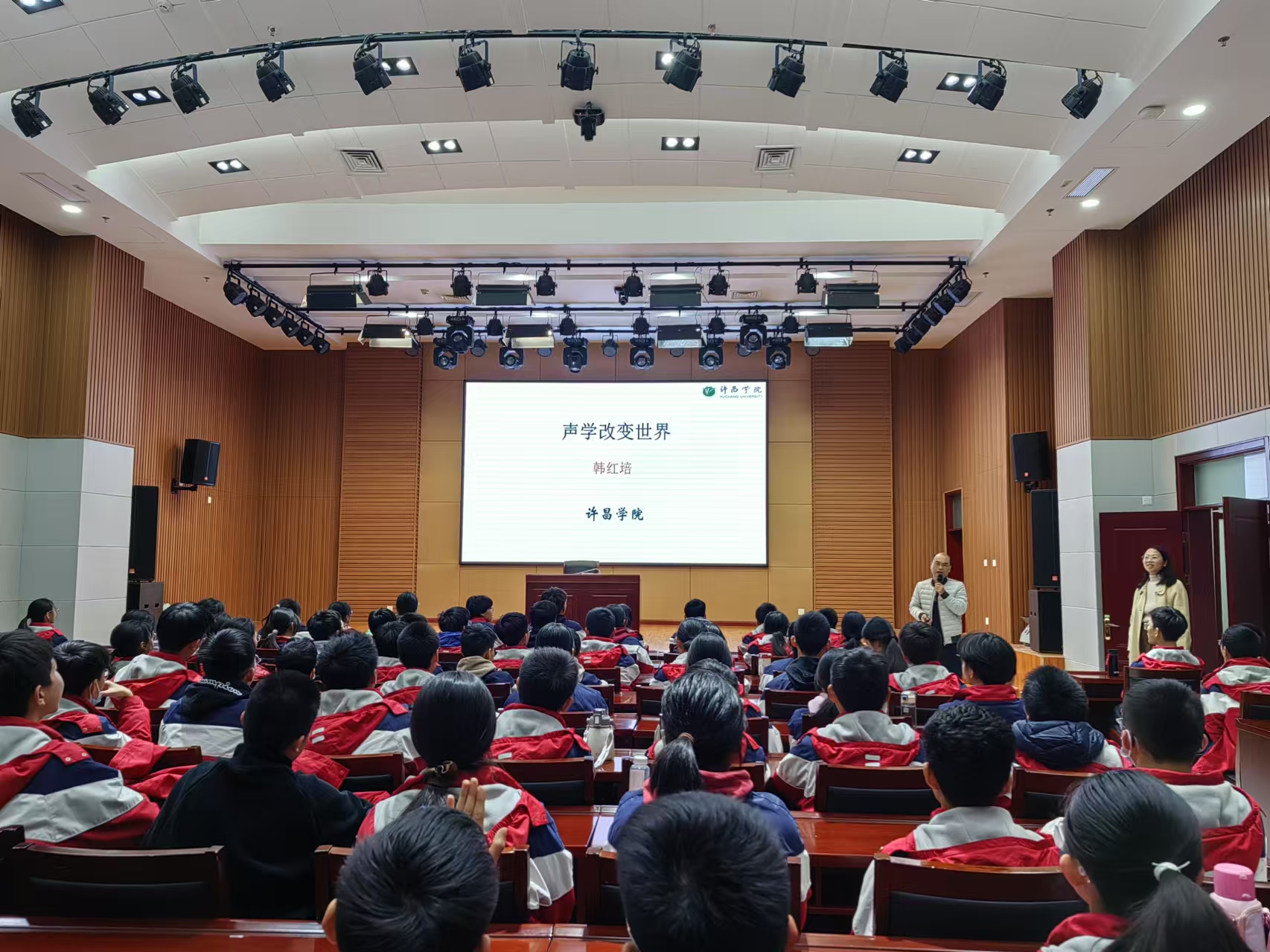 活動(dòng)中,許昌學(xué)院物理學(xué)院教授、博士服務(wù)團(tuán)成員韓紅培在許昌市科技館報(bào)告廳,以《聲學(xué)改變世界》為題,為孩子們帶來(lái)一場(chǎng)生動(dòng)的聲學(xué)講座。韓教授從認(rèn)識(shí)聲學(xué)、走進(jìn)聲學(xué)、前沿聲學(xué)等方面步步深入,帶領(lǐng)學(xué)生走進(jìn)聲學(xué)世界。課堂生動(dòng)鮮活,把高屋建瓴的理論融入實(shí)際生活,得到了同學(xué)們的熱烈呼應(yīng)。隨后,兩位許昌市科技館工作人員為同學(xué)們展示了《與光嬉戲》實(shí)驗(yàn)課。在他們的默契配合下,一個(gè)個(gè)神奇又新穎的光學(xué)實(shí)驗(yàn)依次呈現(xiàn)。在參觀環(huán)節(jié),“傳聲筒”“龍卷風(fēng)”“顛倒屋”“天空艙”等一件件奧秘的展品,激發(fā)了同學(xué)們探索科學(xué)世界的濃厚興趣。