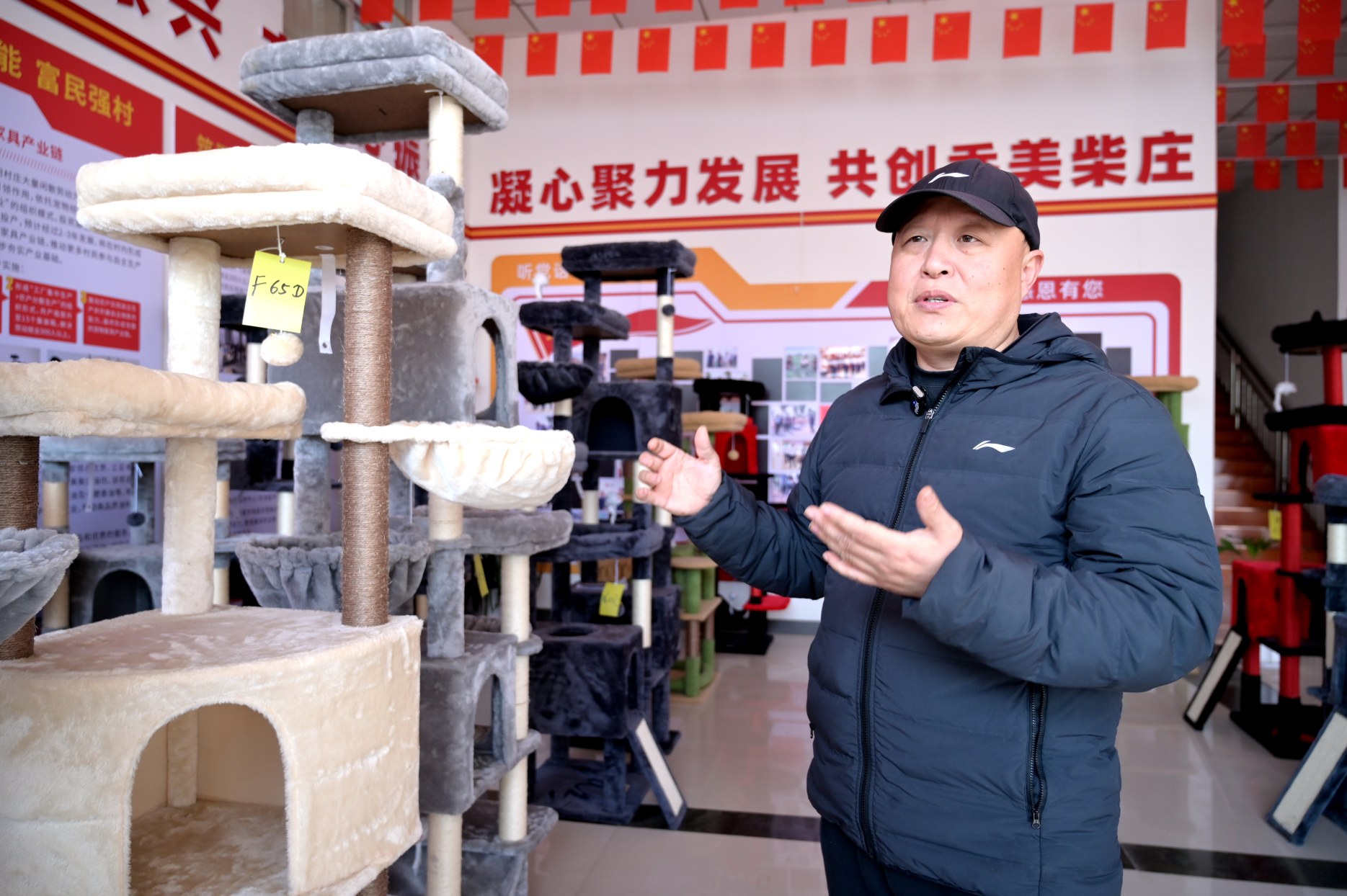 “2024年3月,我們在村里投資建設(shè)了寵物家具廠,引進(jìn)寵物家具生產(chǎn)線,當(dāng)年9月投產(chǎn)?!壁w亞軍說。如今,柴莊村的寵物家具產(chǎn)業(yè)已初具規(guī)模。家具廠占地面積3000余平方米,生產(chǎn)寵物爬架、寵物玩具等系列產(chǎn)品。銷售渠道也日益完善,通過亞馬遜、沃爾瑪?shù)葒H電商平臺,產(chǎn)品遠(yuǎn)銷日韓、歐美等國家和地區(qū),帶動200余人就業(yè),促使村民年增收3萬多元。