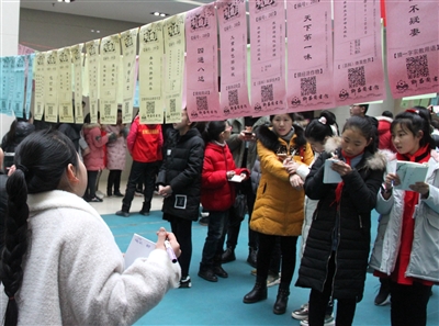 元宵節(jié)期間,300余名市民和讀者參與了許昌市圖書(shū)館舉辦的第六屆“鬧元宵、猜燈謎”有獎(jiǎng)競(jìng)猜活動(dòng)。400條燈謎整齊有序地懸掛在紅繩上,五彩繽紛,營(yíng)造出節(jié)日的喜慶氣氛。謎面內(nèi)容包含漢字、人名、地名、花卉等,還專設(shè)了兒童燈謎,涉及面廣,趣味性強(qiáng),吸引了市民的踴躍競(jìng)猜。