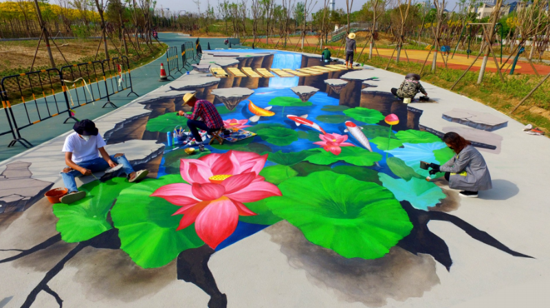 4月8日,工作人員在中央公園繪制3D景觀路。手繪3D景觀通過別出心裁的藝術(shù)創(chuàng)作,呈現(xiàn)立體的視覺效果。觀眾站在相應角度欣賞時,可進入其營造的3D立體空間,實地體驗與畫面相融的奇特感受,暢享3D藝術(shù)畫帶來的魔幻感覺。