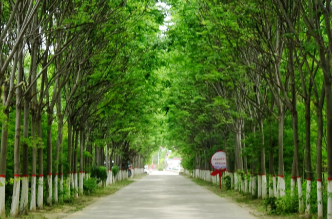 鄢陵縣春暉大道北側(cè)立著一塊大型景觀石,上面刻有“屈崗村”三個大字。該景觀石東側(cè)是一條由南向北延伸的混凝土公路,路邊生長著兩排欒樹。這些樹木十分高大,巨大的樹冠連在一起,把道路上方遮得嚴嚴實實的,使整條道路如時光隧道一般。這里便是屈崗村口。穿過綠色長廊,就進入了屈崗村。該村屋舍墻壁都畫上了弘揚傳統(tǒng)文化的宣傳畫,刷上了宣傳廉政的標語;道路平整,兩側(cè)綠化帶內(nèi)的月季開得正艷,路旁的電線桿上還掛著黨旗、國旗。