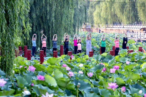 夏日,護(hù)城河中的荷花競(jìng)相開放,美得宛如一幅畫。瑜伽愛好者們?cè)谇О俣涫㈤_的荷花叢中練習(xí)瑜伽,上演一場(chǎng)瑜伽與荷花的美麗約會(huì)。 晨報(bào)攝友 楊望祥 攝