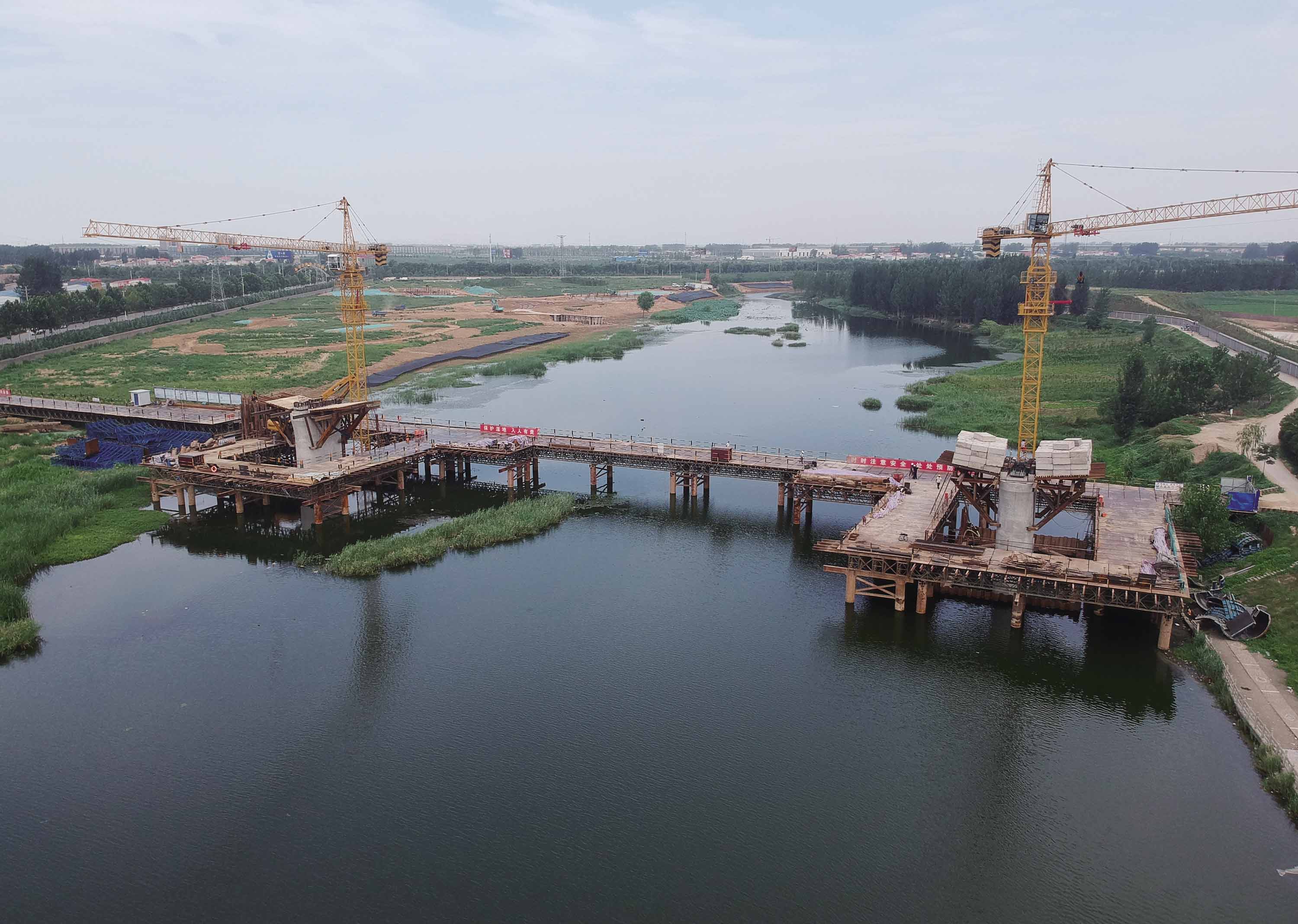 7月23日,在鄭許市域鐵路工程許昌段連續(xù)梁項目建設(shè)現(xiàn)場,工人們正在施工。該項目位于長葛雙洎河濕地公園,以連續(xù)梁形式,交角78°跨越雙洎河,共分為24個對稱澆筑段和3個合龍段,預計11月底項目完工,現(xiàn)在正在進行托架預壓階段施工。