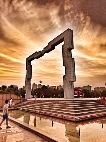 換個(gè)角度按下快門,許都公園里的智慧門成為天空最壯麗的點(diǎn)綴。
