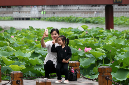 8月10日,一對母女在市區(qū)南護城河望仙橋附近拍照留念。記者 牛書培 攝