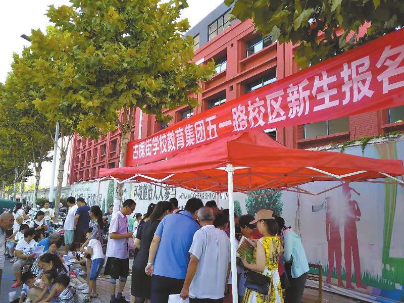 8月16日,市區(qū)學(xué)生家長(zhǎng)帶孩子在新學(xué)?!呕苯謱W(xué)校教育集團(tuán)五一路校區(qū)報(bào)名。據(jù)了解,我市基礎(chǔ)教育提升三年攻堅(jiān)工作啟動(dòng)以來,已陸續(xù)建成了多所學(xué)校。今年秋季我市共有8所學(xué)校能夠投入使用,新增加學(xué)位2萬多個(gè),有效緩解了就近入學(xué)難問題。 孔剛領(lǐng) 攝