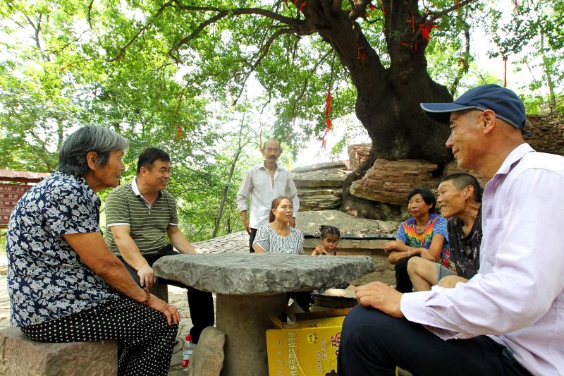 8月23日,郝占濤(左二)與村民在大橿樹下聊天兒。 許昌報業(yè)全媒體記者 牛書培 攝