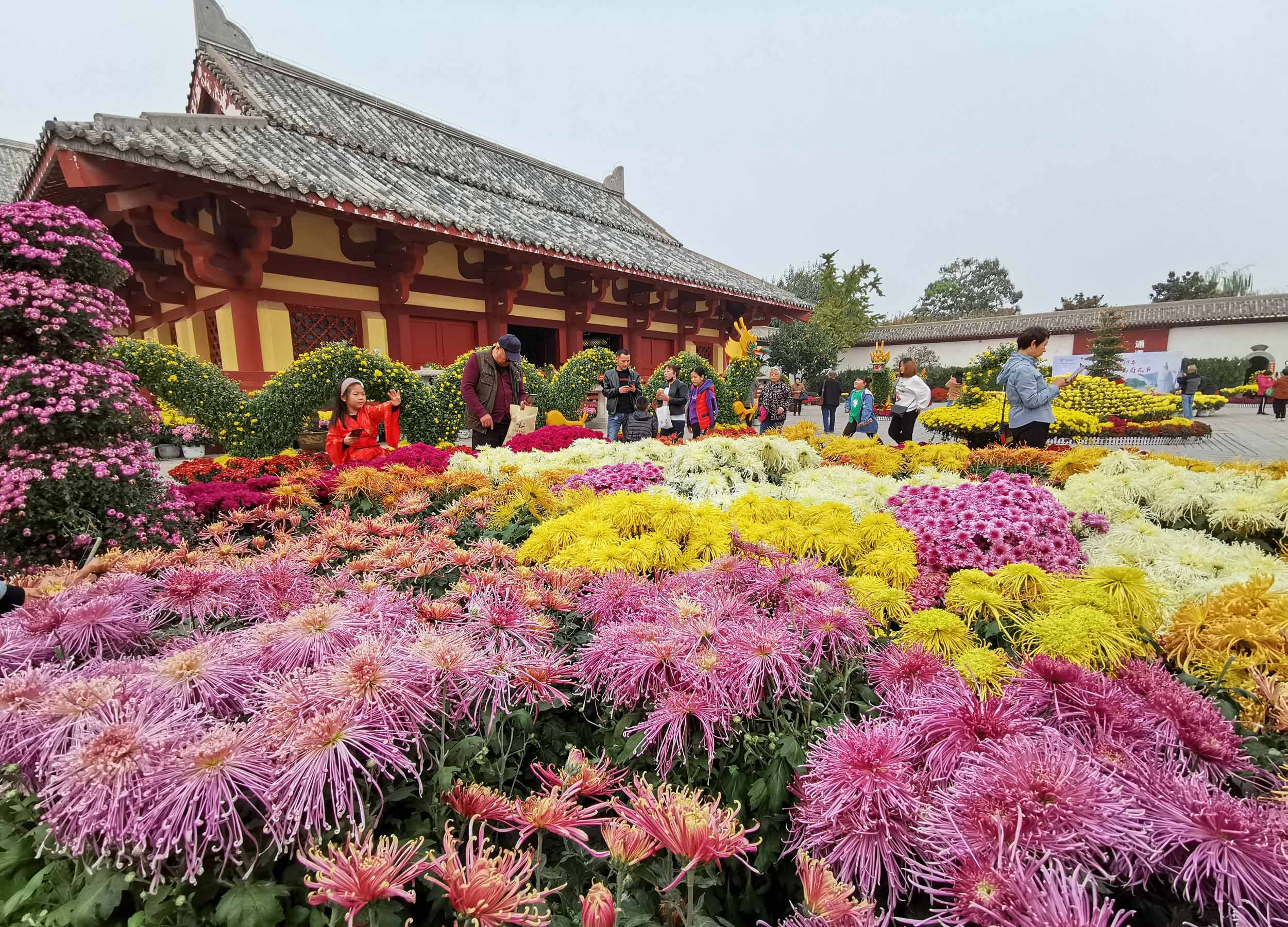 十一月三日,市區(qū)曹丞相府景區(qū)各色菊花爭奇斗艷、姹紫嫣紅,吸引眾多游客前來觀賞游玩。該景區(qū)此次展出的菊花主要以紅、粉、黃、白、紫色調(diào)為主,各類造型花卉六十余種五萬多盆,為秋日許都增添了一抹亮色。