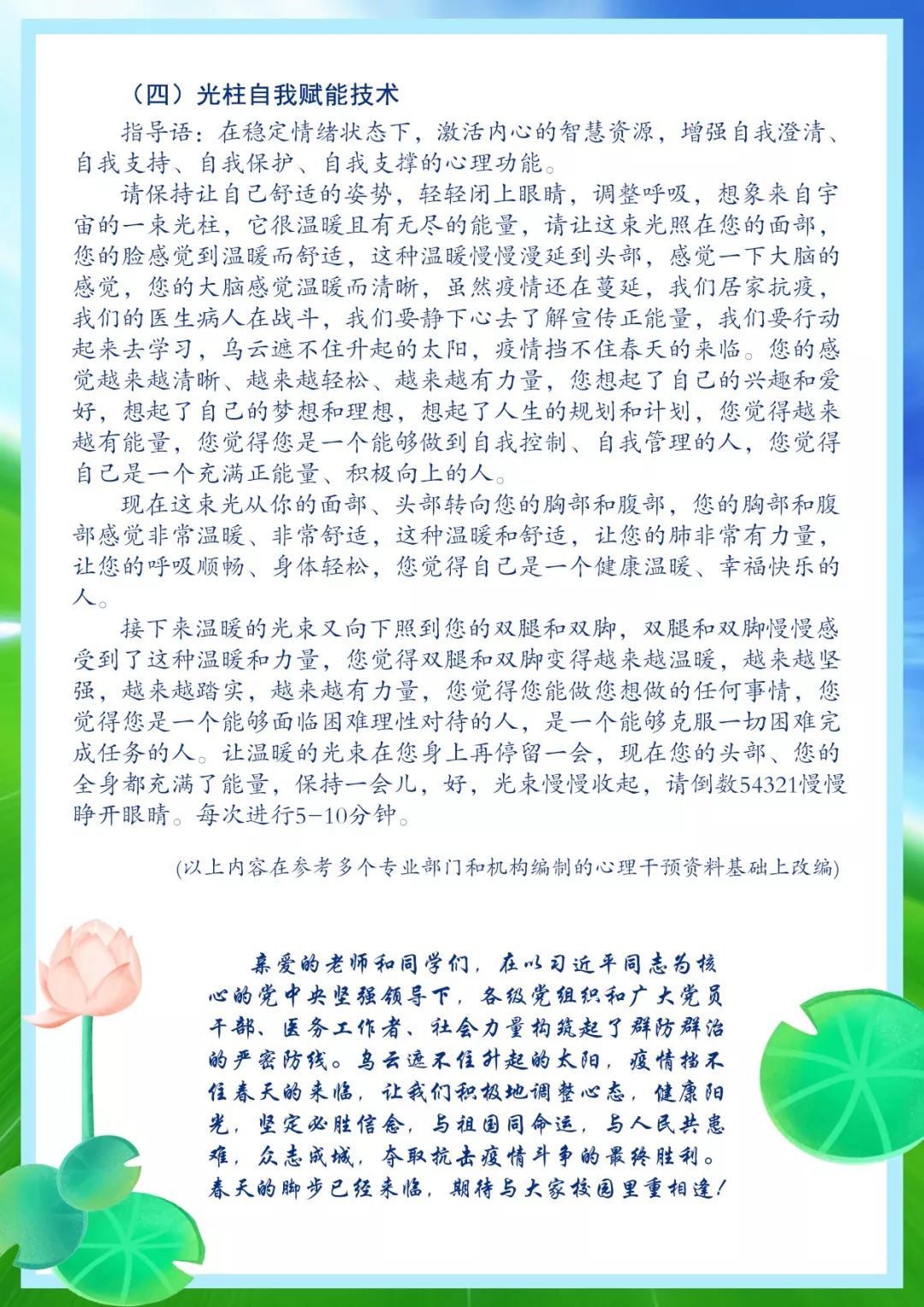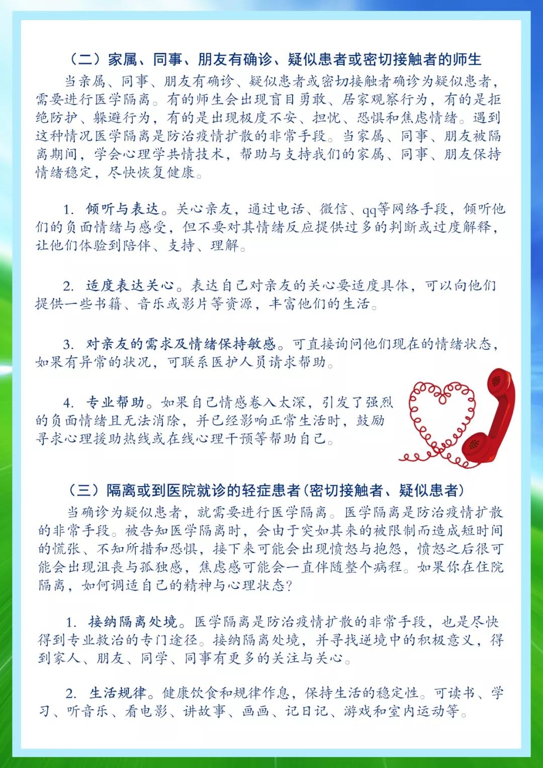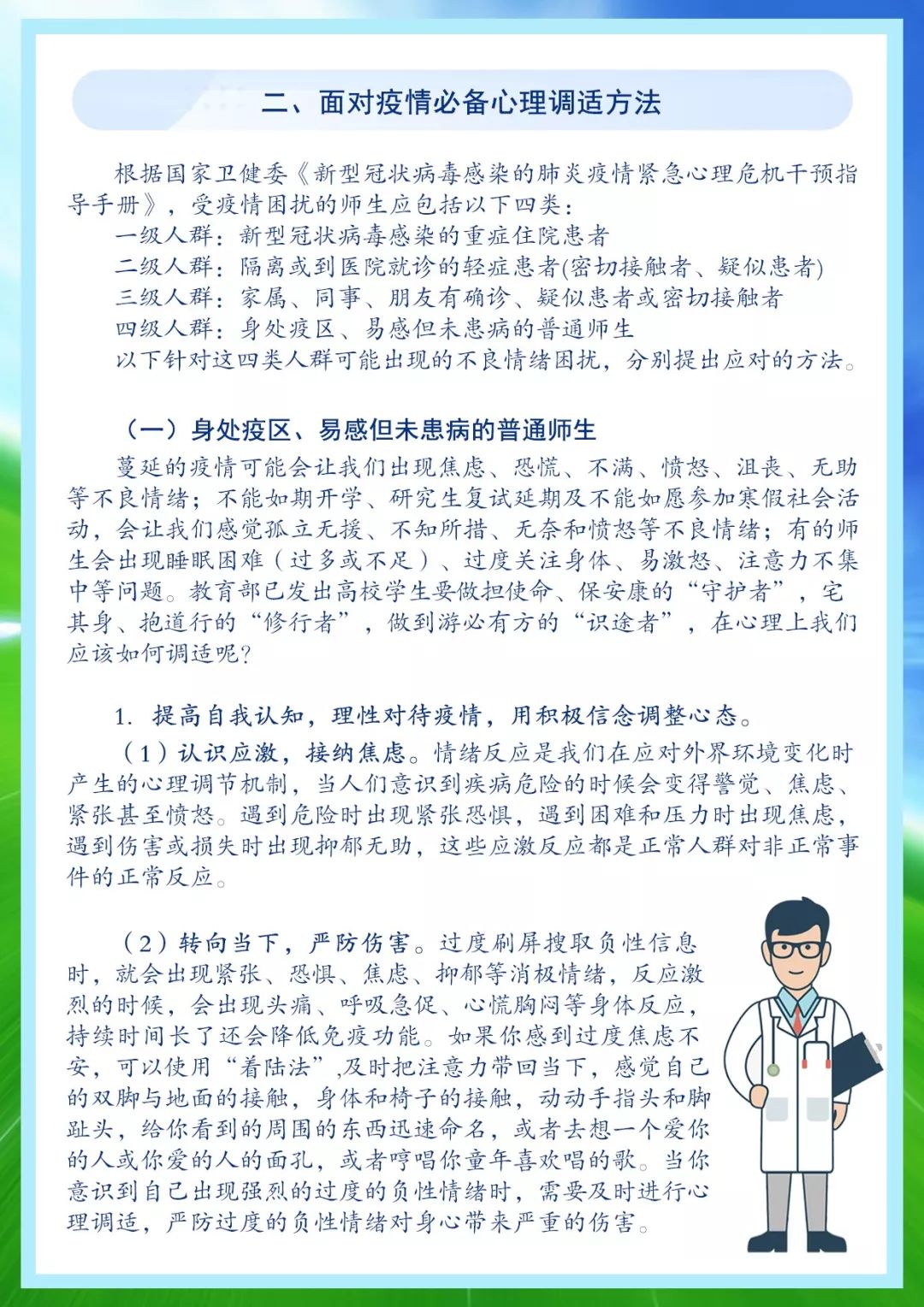 為了幫助廣大師生理性客觀面對(duì)疫情,掌握科學(xué)的自我心理調(diào)適和疏導(dǎo)方法,保持積極健康的心態(tài),省新冠肺炎疫情防控指揮部教育系統(tǒng)工作專班研究制定了河南省高校師生心理應(yīng)對(duì)手冊(cè)。
