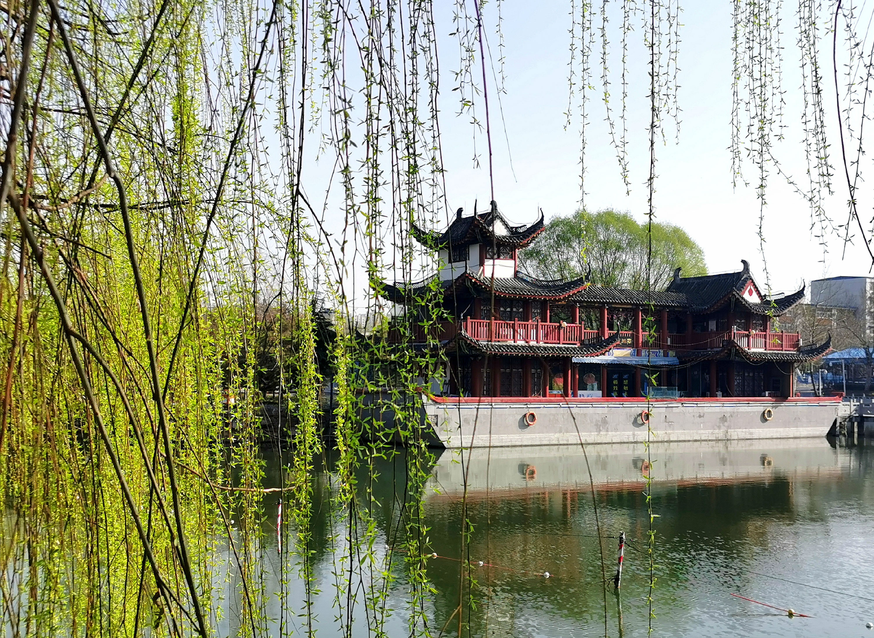 3月11日,記者在西湖公園看到,湖邊的柳樹綠意蔥蘢,長(zhǎng)長(zhǎng)的柳枝輕拂堤岸,與波光瀲滟的湖面和古色古香的亭臺(tái)樓閣相互映襯,猶如一幅美麗的畫卷。