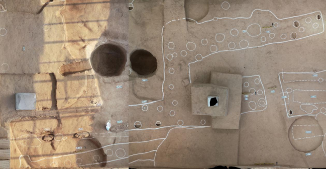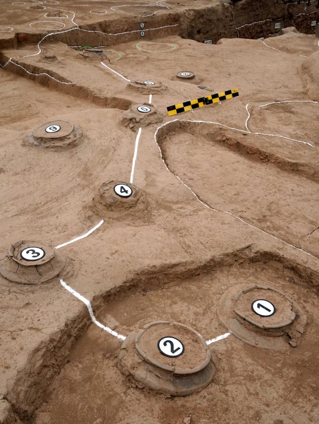 甕城是古代城市的主要防御設(shè)施之一,通常是在城門外或內(nèi)側(cè)修建的半圓形或方形的護(hù)門小城。河洛古國的中心居址區(qū)已有典型的甕城建筑結(jié)構(gòu),可見居住者非同一般。這里發(fā)現(xiàn)有4排大型房址,房址之間有巷道相通,其中最大的一個(gè)房子面積達(dá)220平方米,即使放到今天看也屬于豪宅。擺成北斗星形狀的九個(gè)陶罐就是在這所房子前面的門廊發(fā)現(xiàn)的。