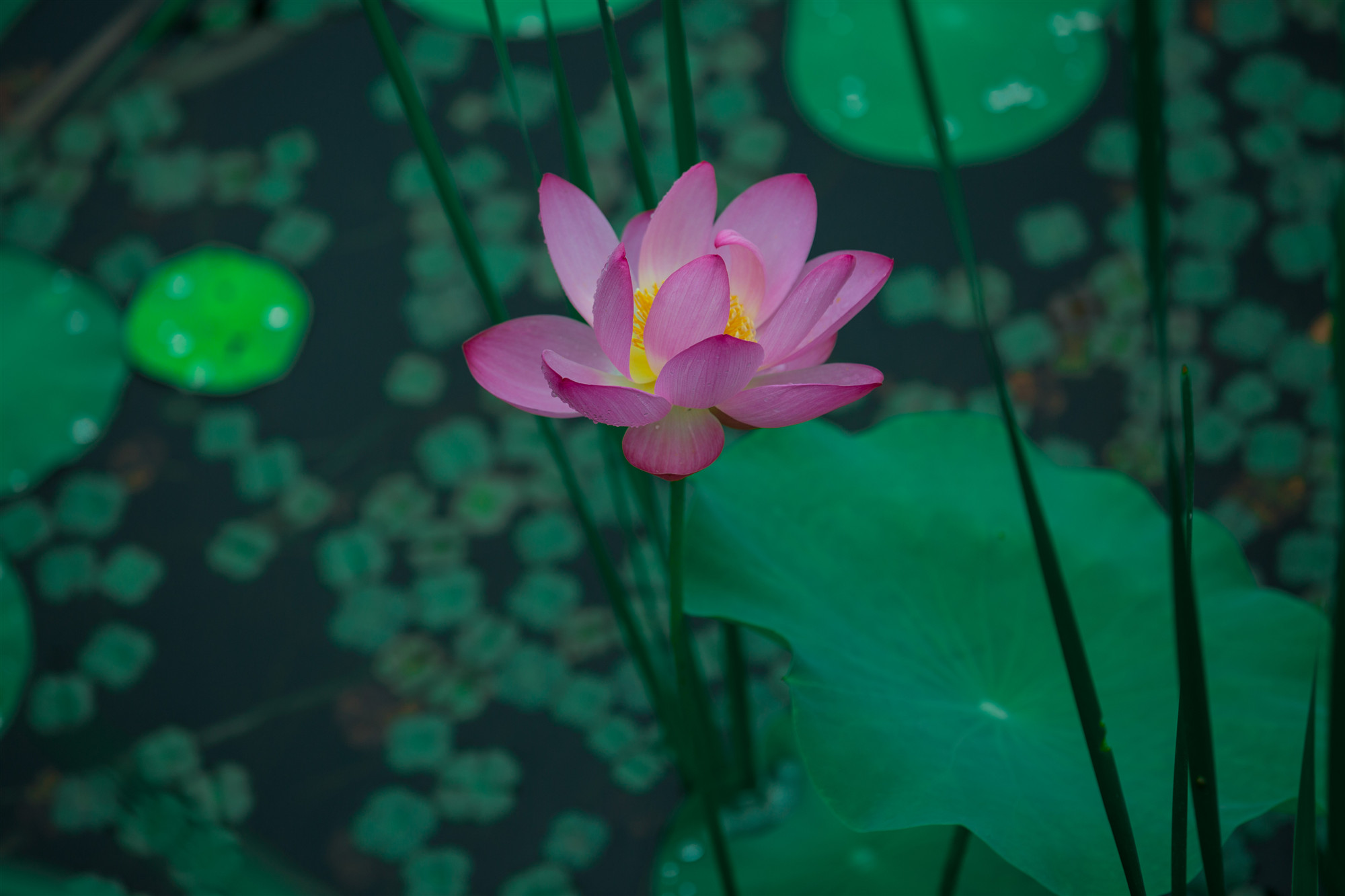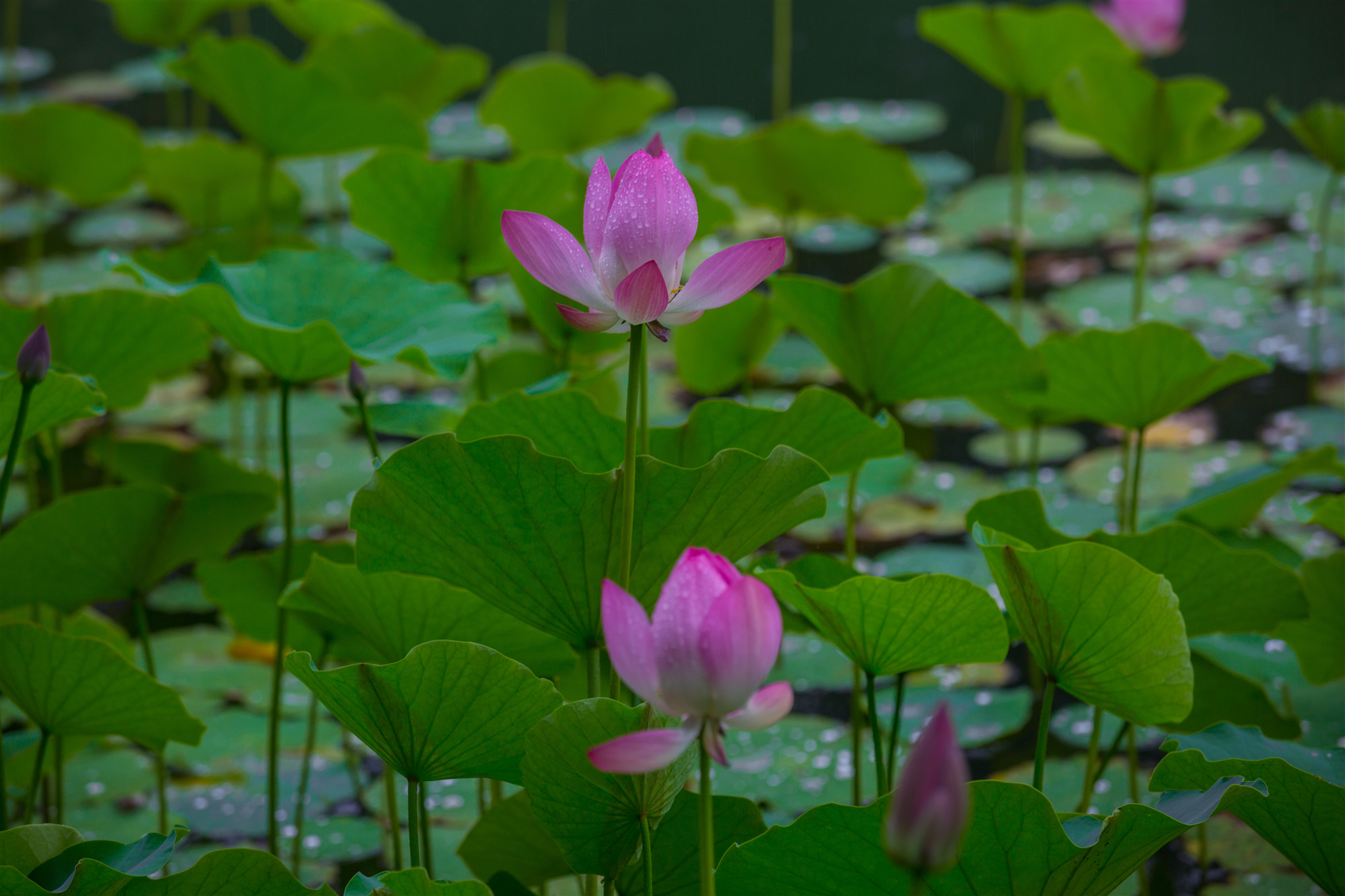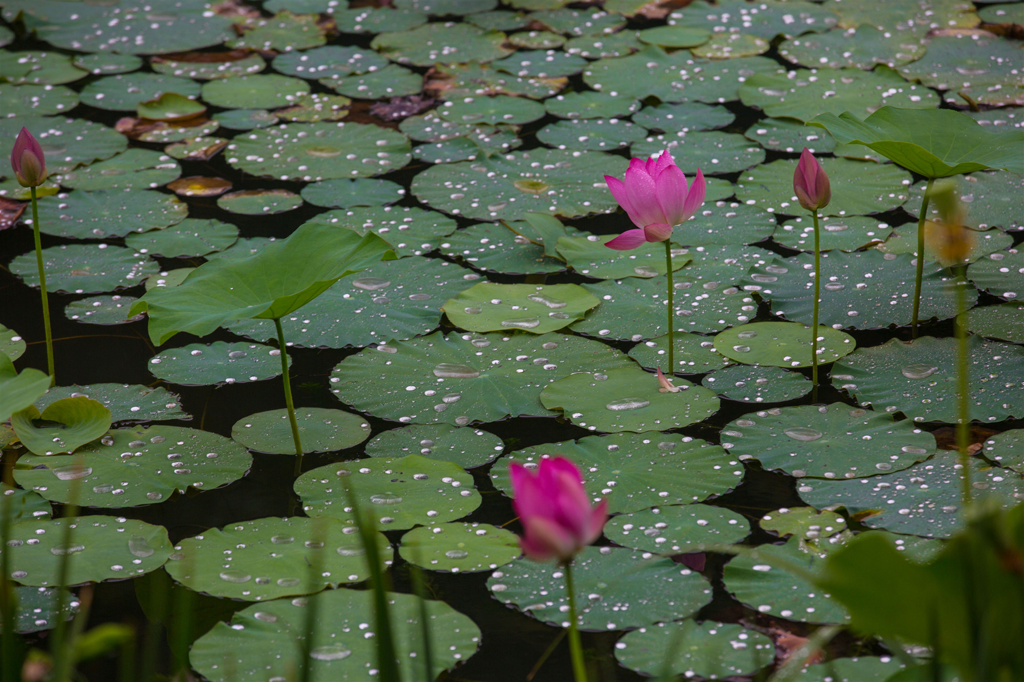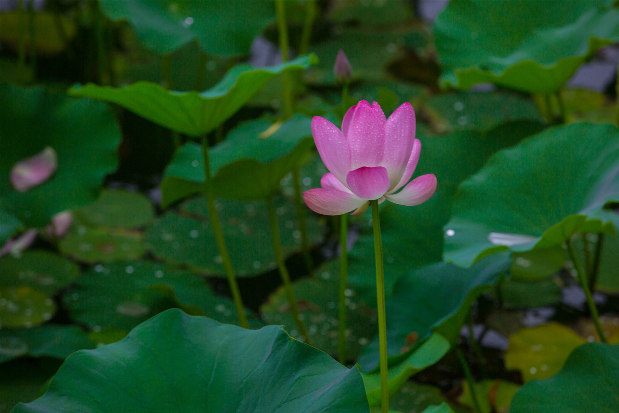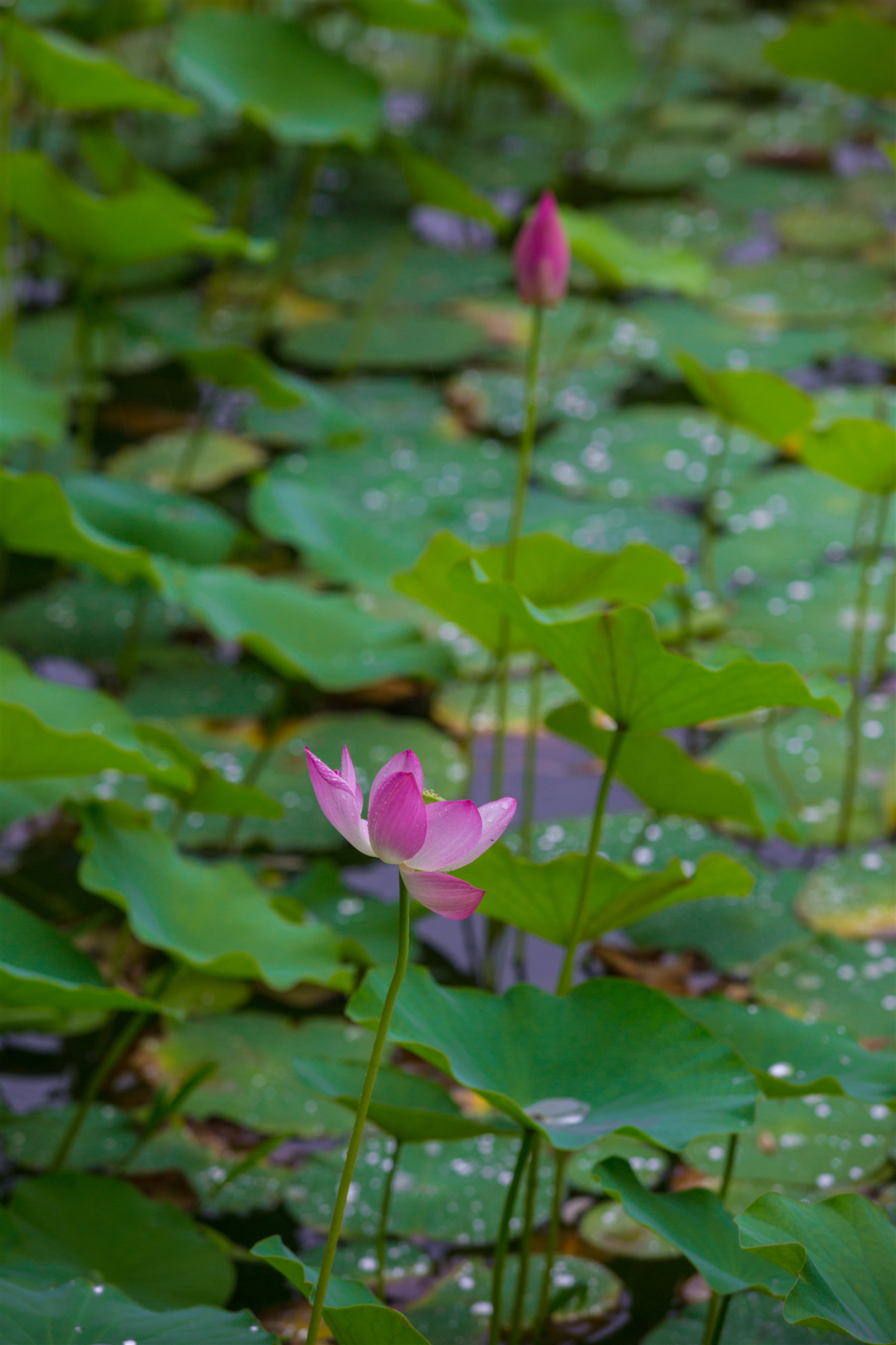 翠綠、渾圓、厚重的荷葉映襯得荷花格外亭亭玉立,像披著輕紗在湖中沐浴的少女,嬌羞頷首、盈盈欲滴。