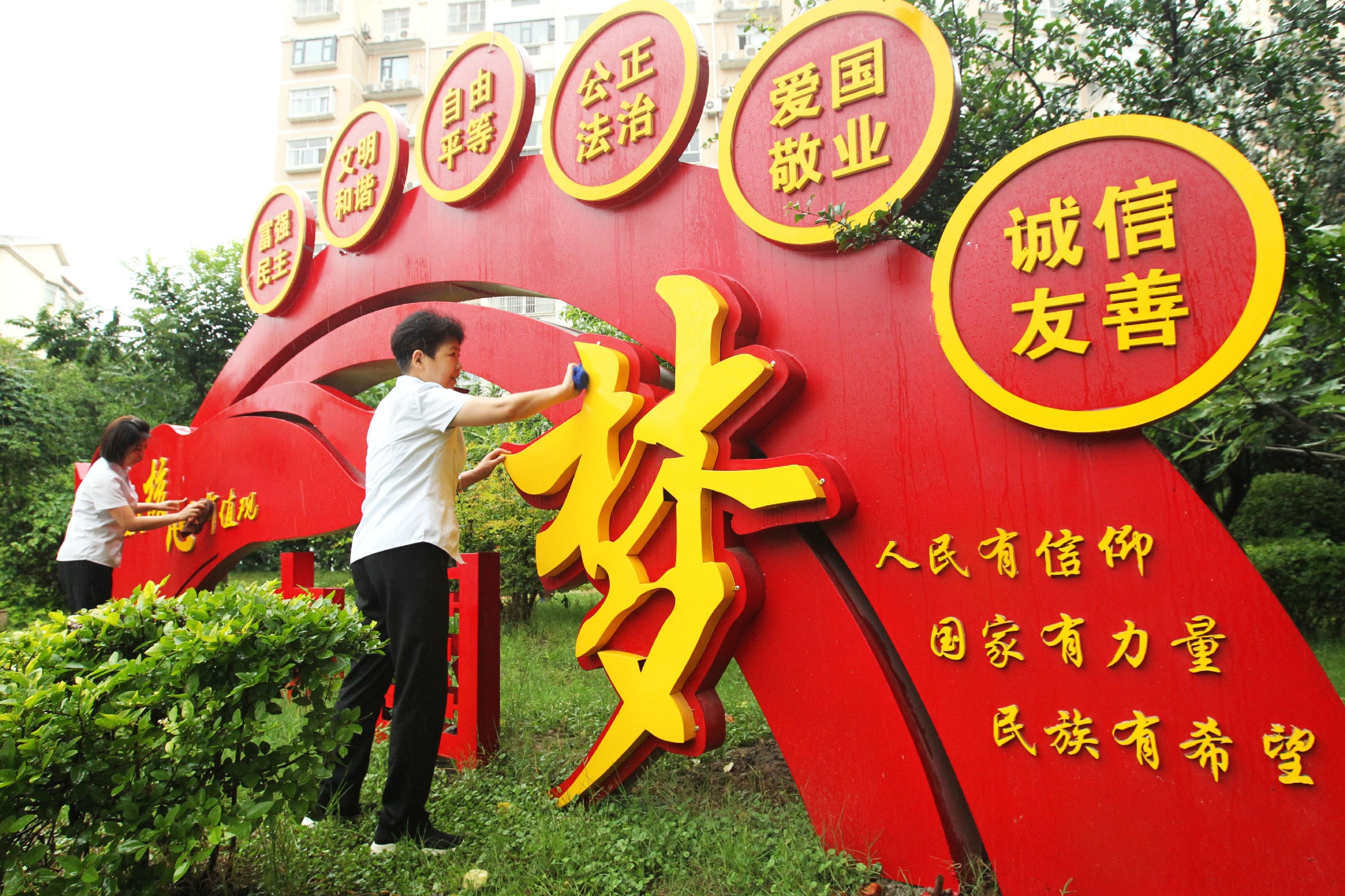 6月17日,東城區(qū)天寶路街道辦事處祥瑞小區(qū)的物業(yè)人員在小區(qū)內(nèi)擦拭社會(huì)主義核心價(jià)值觀標(biāo)牌。近年來,為營(yíng)造創(chuàng)建全國(guó)文明城市的濃厚氛圍,我市在各大游園、公園、廣場(chǎng)、社區(qū)、主干道添置了文明標(biāo)牌。一個(gè)個(gè)文明標(biāo)牌將社會(huì)主義核心價(jià)值觀和文明新風(fēng)尚融入市民生活,融入城市環(huán)境,讓市民抬眼可見,潛移默化地接受文明理念的熏陶。記者 牛書培 攝