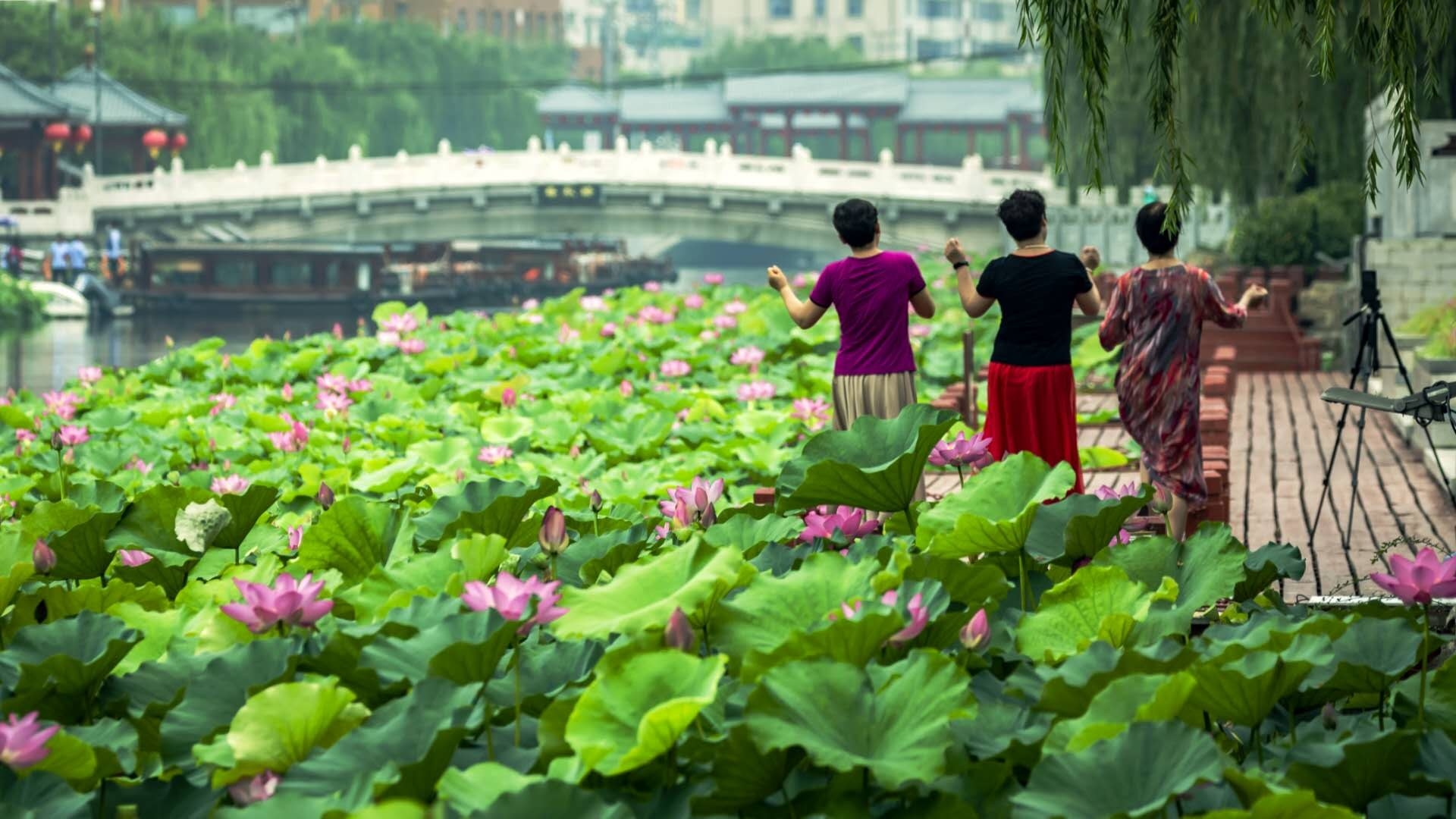 護(hù)城河畔,幾個(gè)市民跟著一池荷花翩翩起舞,陶醉在迷人的景色中。 晨報(bào)攝友 楊望祥 攝