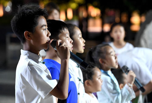 在河南鞏義一處公園內,孩子們在詩會上朗誦詩歌(6月19日攝)。新華社記者 李安 攝