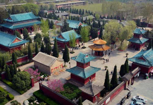 嘉應(yīng)觀始建于1723年,是雍正為了紀(jì)念在武陟修壩堵口、祭祀河神、封賞治河功臣而建造的淮黃諸河龍王廟,建筑布局效仿故宮,集宮、廟、衙署為一體。觀內(nèi)有雍正親自撰文并書寫的銅碑,立在一河蛟身上,意在鎮(zhèn)惡。
