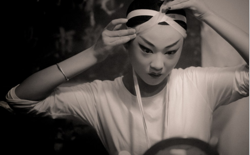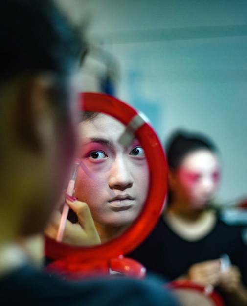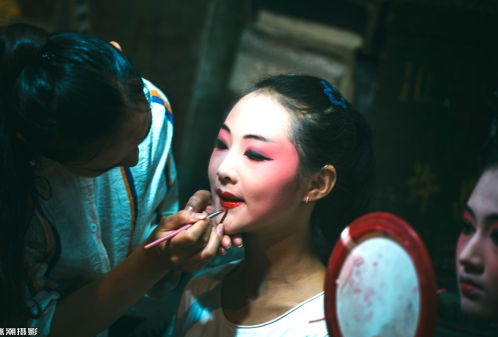 準(zhǔn)備上戲臺的孩子們在后臺認(rèn)真梳妝,這一幕也成為一道迷人的風(fēng)景線。
