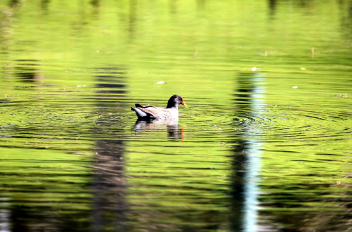 10月19日,一只水鳥在秋湖濕地游弋。