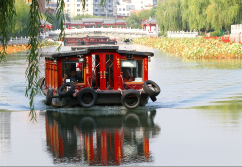 10月19日,游客乘坐游船在護城河內(nèi)賞秋。