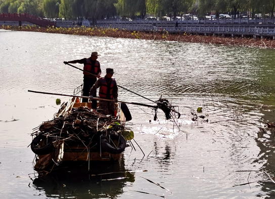 11月2日上午,市區(qū)南護(hù)城河西段望仙橋邊,兩名市政工人正在收割、打撈枯萎的荷葉。 市市政實(shí)業(yè)集團(tuán)有限公司護(hù)城河養(yǎng)護(hù)項(xiàng)目部負(fù)責(zé)人姜晨龍介紹,枯萎的荷葉如不及時(shí)收割、打撈,會(huì)在河中腐爛,進(jìn)而影響水質(zhì)。10月下旬以來(lái),他們出動(dòng)了20名工人和7條保潔船實(shí)施作業(yè)。預(yù)計(jì)本月上旬,護(hù)城河中所有的枯萎荷葉將清理完畢。記者 呂正子 攝