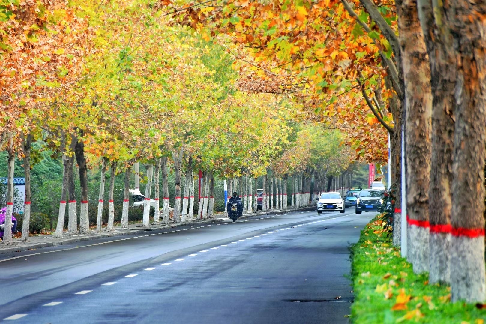 梧桐葉呈現(xiàn)出斑斕的色彩,把道路映襯得如詩如畫。 晨報攝友 風華絕代 攝