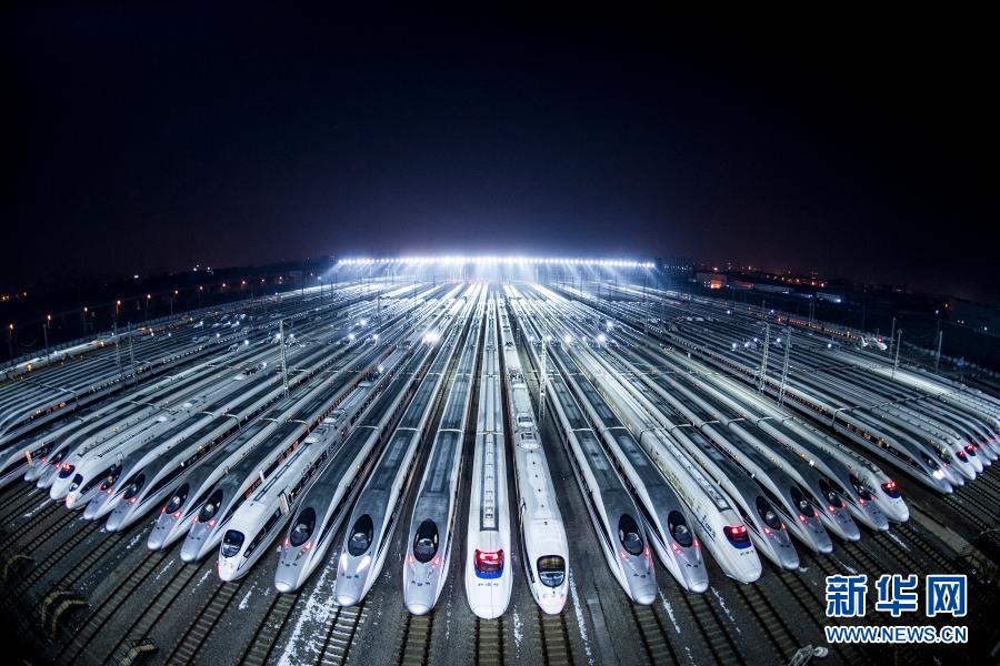 動(dòng)車組??吭谖錆h動(dòng)車段的存車線上,準(zhǔn)備進(jìn)行檢修和保溫作業(yè)(2018年2月1日攝)。新華社記者 肖藝九 攝
