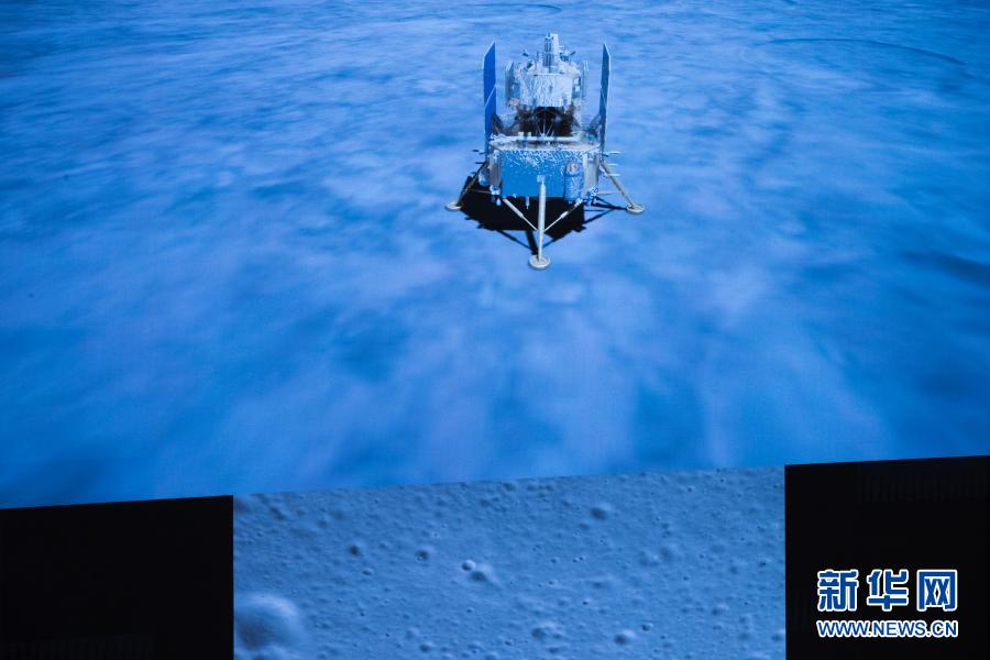 2020年12月1日23時(shí)11分,嫦娥五號(hào)探測(cè)器成功著陸在月球正面西經(jīng)51.8度、北緯43.1度附近的預(yù)選著陸區(qū),并傳回著陸影像圖。這是在北京航天飛行控制中心拍攝的嫦娥五號(hào)探測(cè)器落月瞬間。新華社記者 金立旺 攝