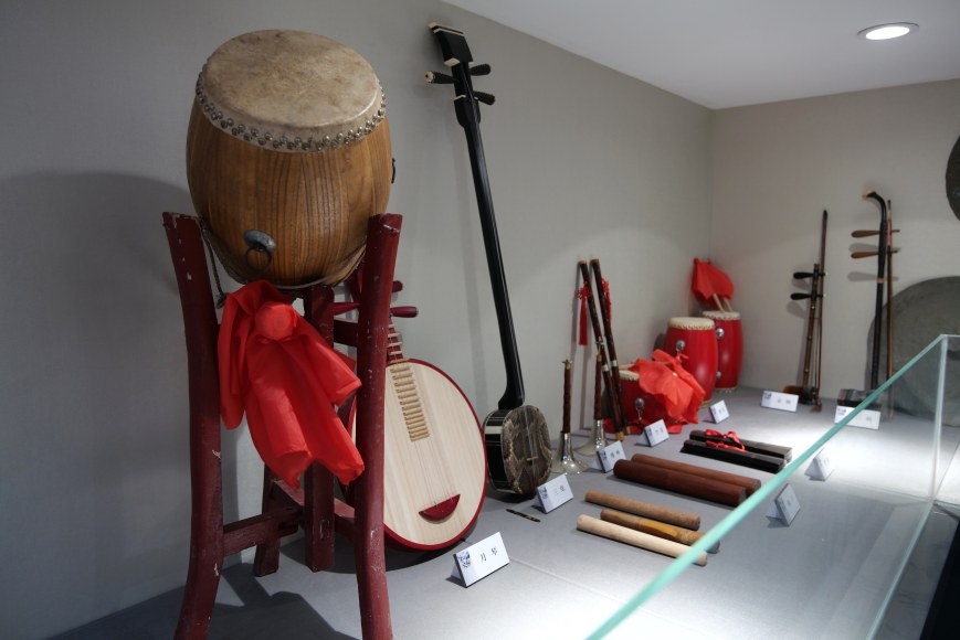 在樂器展示區(qū),講解員向記者介紹了該館從民間收集而來的曲胡和板胡:“它們有著時(shí)代特色和歷史意義。這把曲胡已經(jīng)有100余年的歷史,它的主人曾用它四處演出。后來,他把這把曲胡傳給了自己的學(xué)生張大力。由于長時(shí)間按拉,弦桿表面被按出了2毫米深的弦溝。這把板胡是許昌豫劇團(tuán)于1966年制成的,材質(zhì)為紫檀木?!背酥?,戲曲樂器也種類繁多。如鐃,它是一種擊樂器,銅制,圓形,中間隆起部分小,每副有兩片。如鈸,它俗稱镲,銅制,圓形,中間隆起部分大,兩片相擊發(fā)聲?!斑@四對(duì)古老的大镲為手工制作,看起來很笨重。”講解員說道。
