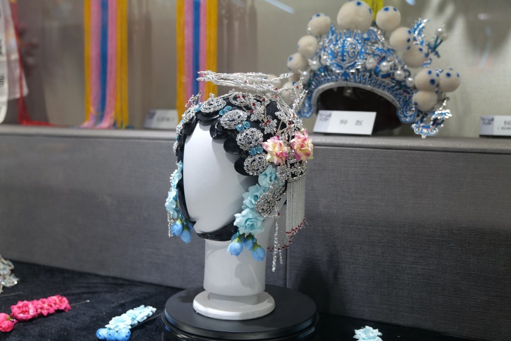 頭面指的是頭部的裝飾品。記者在展示區(qū)看到了諸多頭面,其中,有閃閃發(fā)光的水鉆頭面。水鉆頭面有紅、白、青、粉四色,經(jīng)過頭面銅胎、銅胎鍍銀等工序制作而成。水鉆頭面有南北派之分。南北派件數(shù)大致相同,但南派做工更加細(xì)致。展示區(qū)還有色彩鮮艷的點(diǎn)翠頭面。點(diǎn)翠頭面一般是傳統(tǒng)戲曲的旦角演員所戴頭飾,主要由翠鳥羽毛、水鉆和純銀為主要材料,經(jīng)過專業(yè)制作而成。為了保護(hù)翠鳥,現(xiàn)在的頭面大多用綢子替代翠鳥羽毛,稱為點(diǎn)綢。
