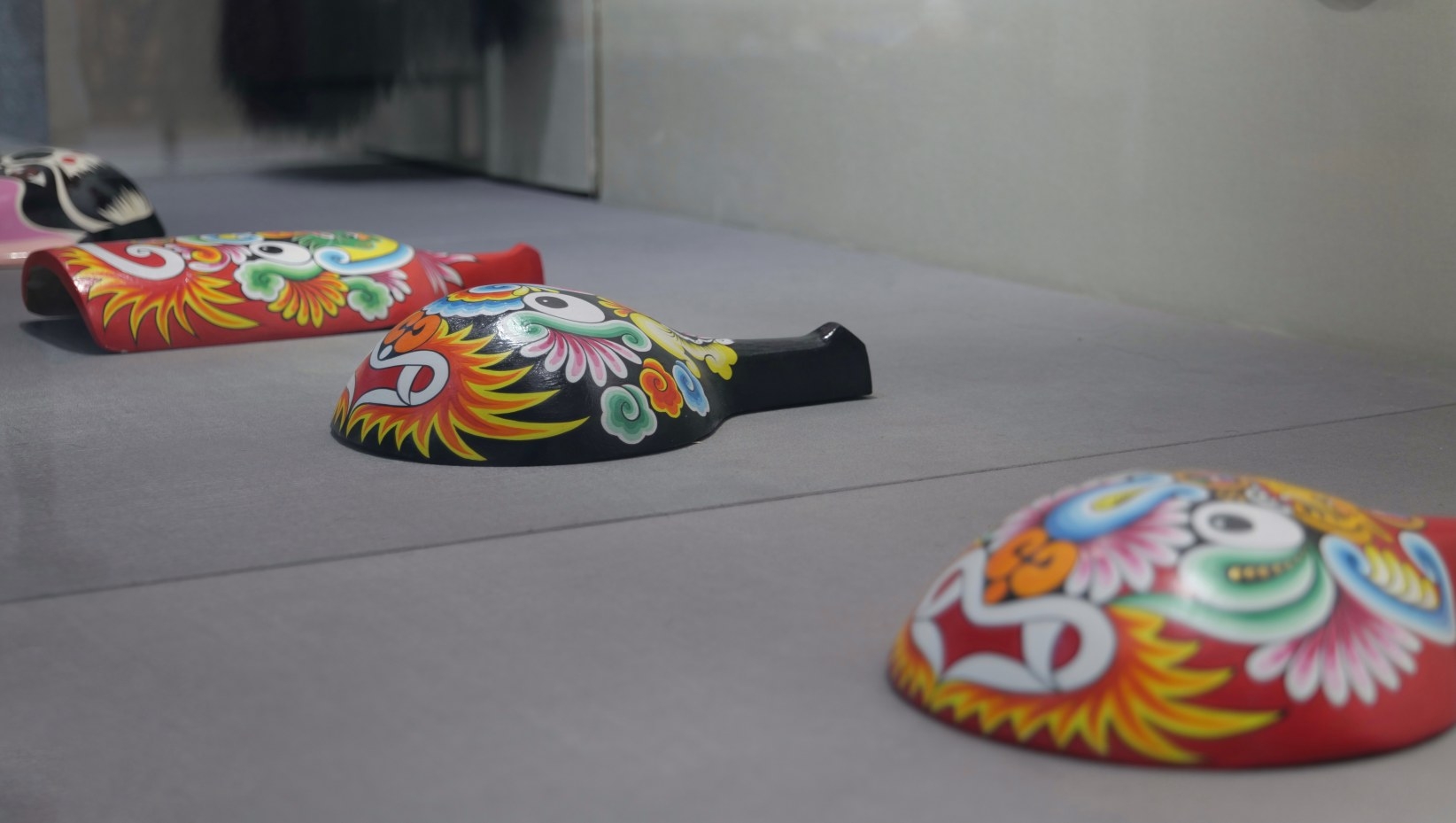 “五福臉譜以紅色、黃色、綠色、紫色、白色為主,分別代表福神、祿神、壽神、喜神、財(cái)神,又稱五福臨門。這些臉譜上面都有一個(gè)錢幣的圖案,代表財(cái)源滾滾,吉祥如意。馬勺臉譜源于陜西鳳翔,多由桃木和柳木制成。”講解員介紹。