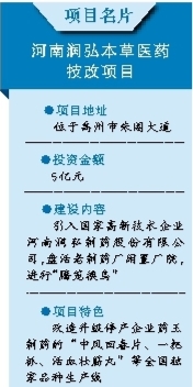 該項(xiàng)目是禹州市中醫(yī)藥企業(yè)戰(zhàn)略重組和技術(shù)改造項(xiàng)目,由河南潤弘制藥股份有限公司投資建設(shè)。據(jù)悉,該項(xiàng)目總投資5億元,通過引入國家高新技術(shù)企業(yè)河南潤弘制藥股份有限公司,盤活老制藥廠閑置廠院,進(jìn)行“騰籠換鳥”,改造升級(jí)停產(chǎn)企業(yè)藥王制藥的“中風(fēng)回春片、一把抓、活血壯筋丸”等全國獨(dú)家品種生產(chǎn)線。