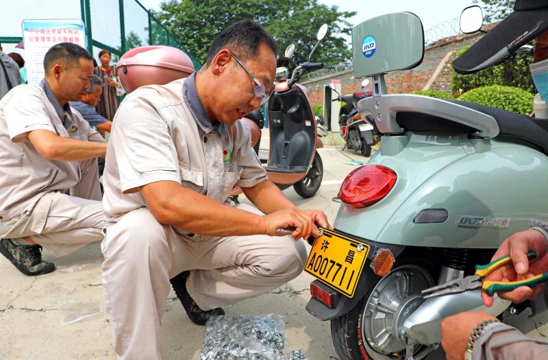 7月7日,工作人員在許昌市魏都區(qū)人民政府院內為市民免費登記安裝電動車標識牌。據(jù)悉,我市自7月7日至7月20日將逐步批量實施電動車標識牌安裝。市民可以在魏都區(qū)和市城鄉(xiāng)一體化示范區(qū)共20個安裝點免費登記安裝電動車標識牌,符合國標的二輪電動車上綠牌,不符合國標的二輪電動車及三輪、四輪電動車上黃牌。 記者 譚宜姝 攝