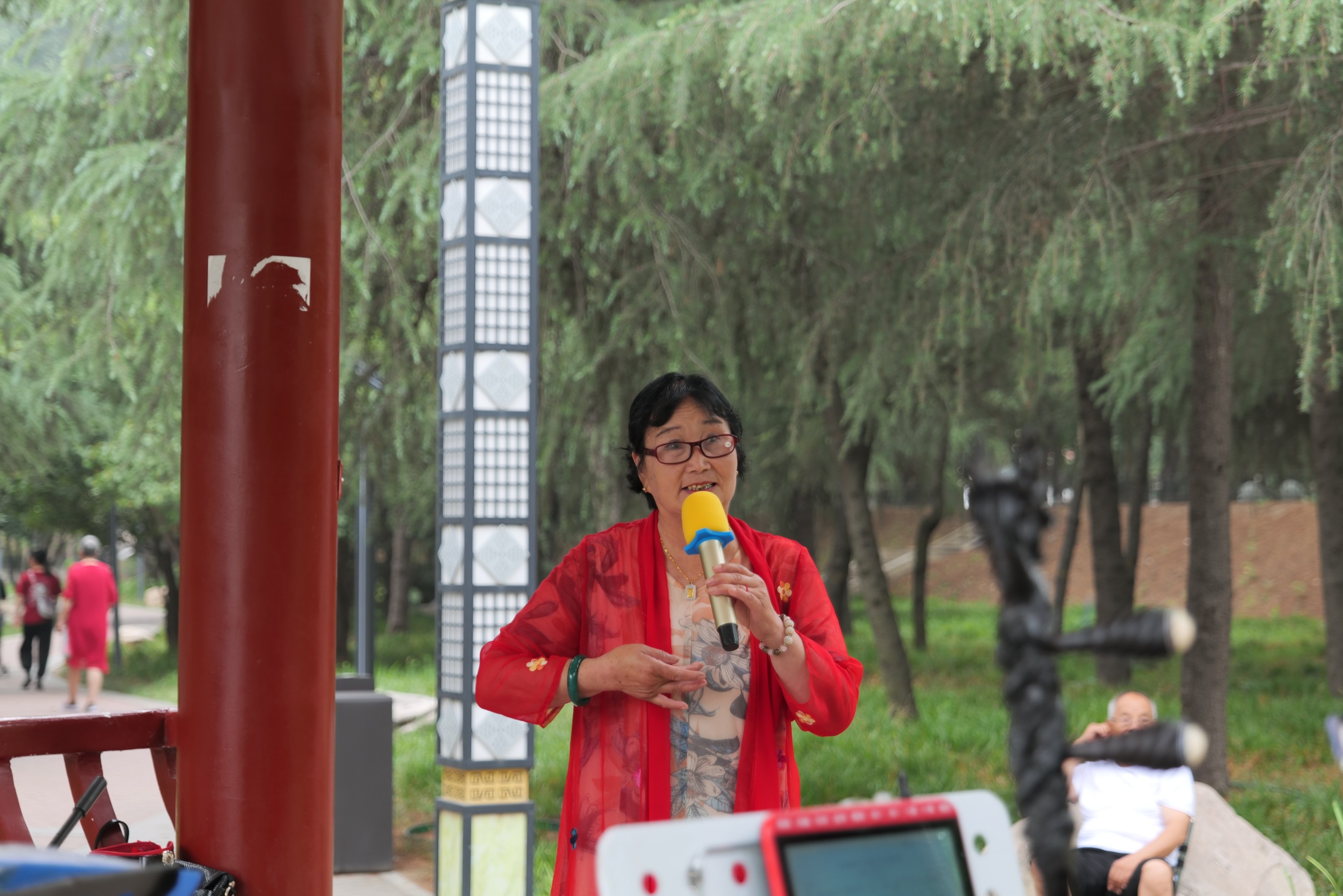 我順著李偉的指引望去,一襲紅衣、淺色內(nèi)搭、紅框眼鏡、利落短發(fā)、穩(wěn)健步伐,這哪里像70歲的人!