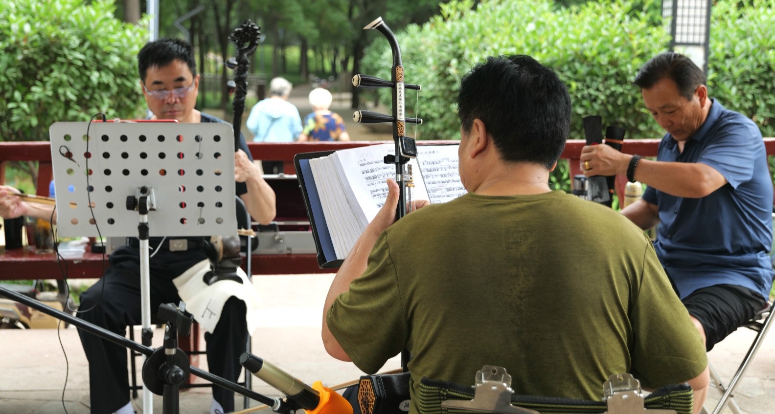 沒有過多的寒暄,喬峰拿出二胡,取出折疊板凳,在亭子里找了個(gè)空隙坐定。
