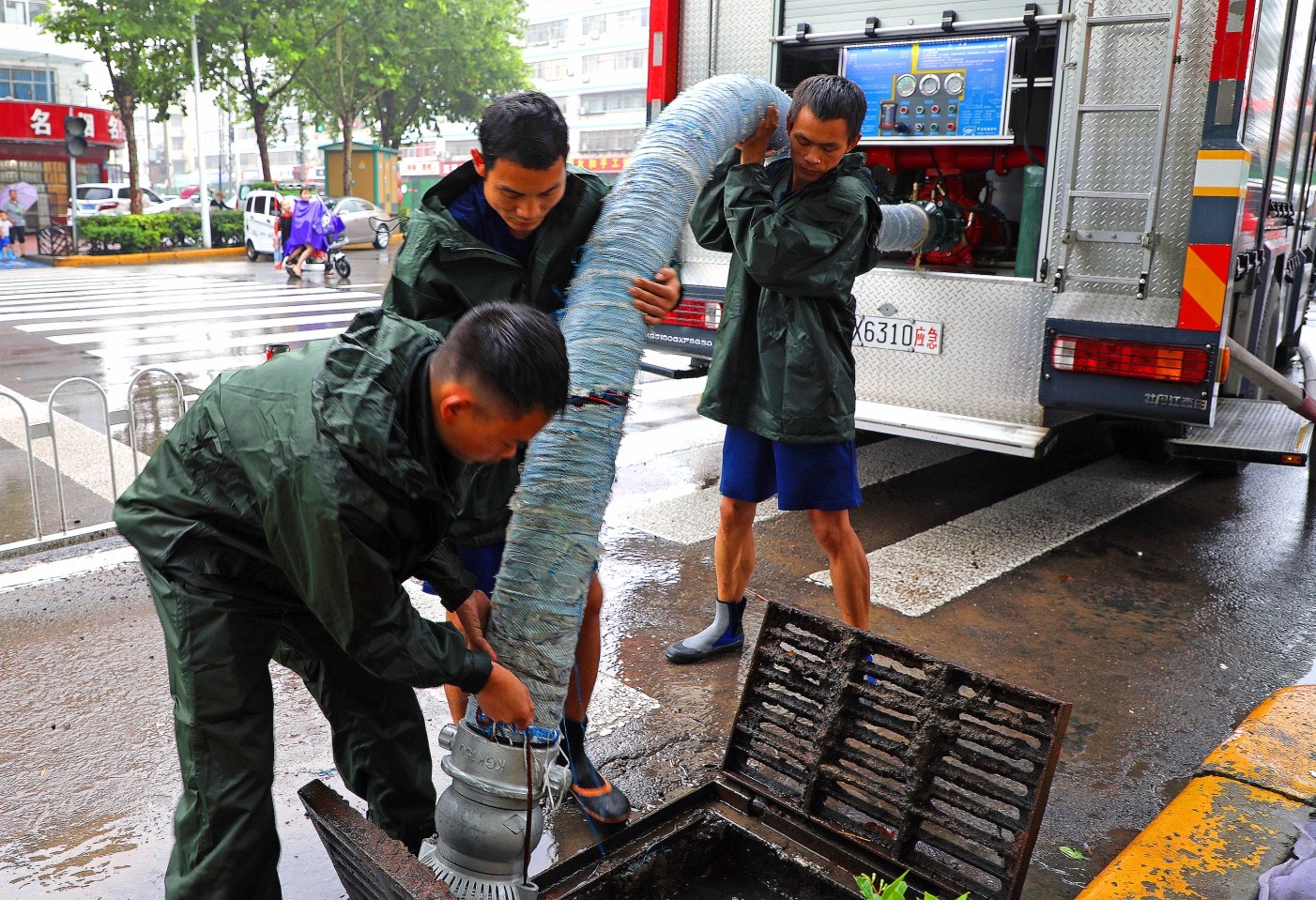 7月21日,市消防救援支隊八一路消防站救援人員對八一路周邊小區(qū)進行排澇。 本報記者 譚宜姝 攝