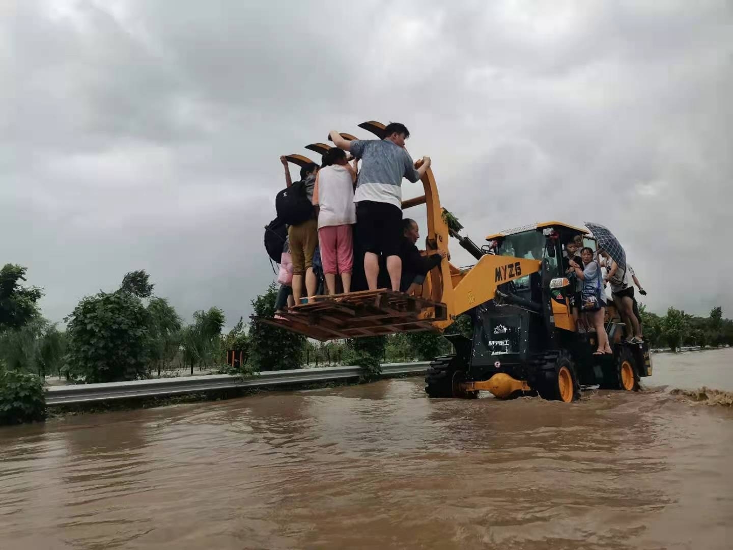 7月21日下午,在長葛市境內(nèi)的107國道雙洎河橋,救援人員用鏟車轉(zhuǎn)移附近村莊的被困群眾。 黃增瑞 攝