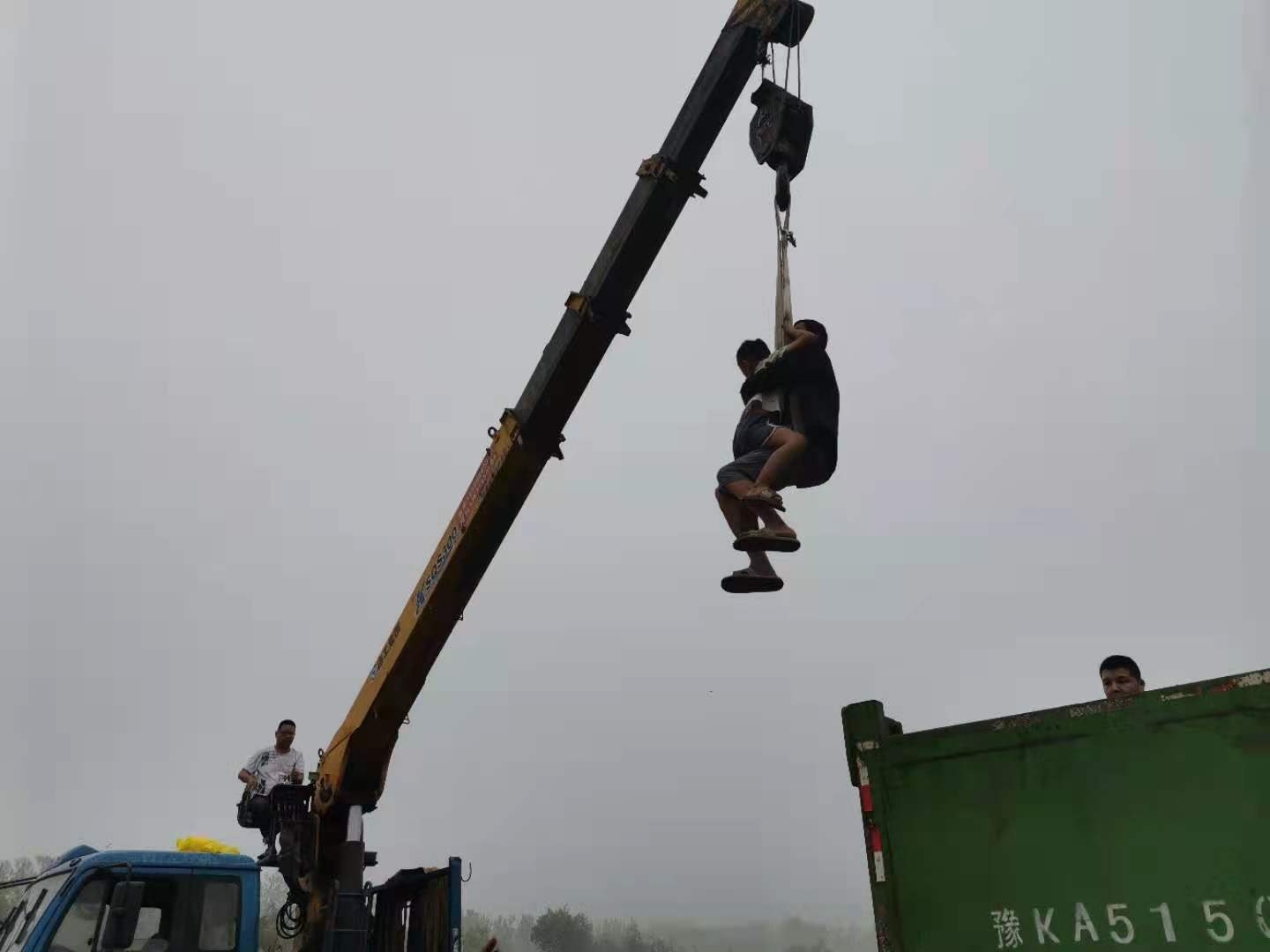 7月21日下午,在長葛市大周鎮(zhèn)夏張村,救援人員使用吊車轉(zhuǎn)移被困群眾。 黃增瑞 攝