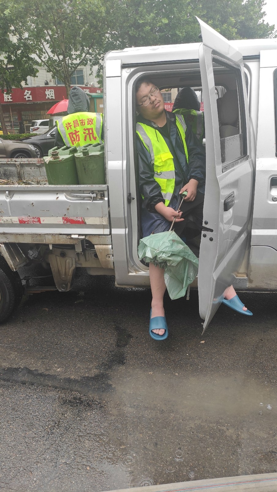 7月21日中午,雨一直在下,記者看到這樣一幕:一輛工具車(chē)的車(chē)廂里,連續(xù)工作了27個(gè)小時(shí)的市政工人王繼鵬,換班間隙,在車(chē)上“瞇”了幾分鐘。幾分鐘后,他又投入了緊張的工作!