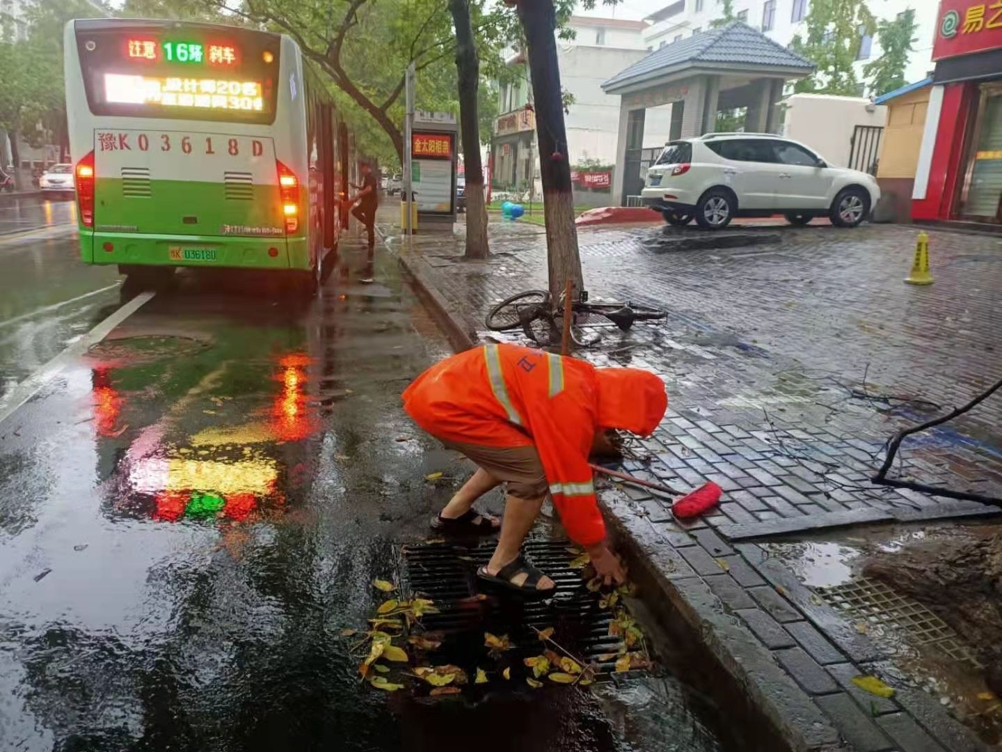 由于暴雨來(lái)得急,持續(xù)時(shí)間相對(duì)較長(zhǎng),導(dǎo)致大街上要么是“小溪”,要么是“汪洋”。樹(shù)葉、樹(shù)枝、塑料袋等都堵在下水道口,環(huán)衛(wèi)工人冒雨清理下水道口的垃圾。