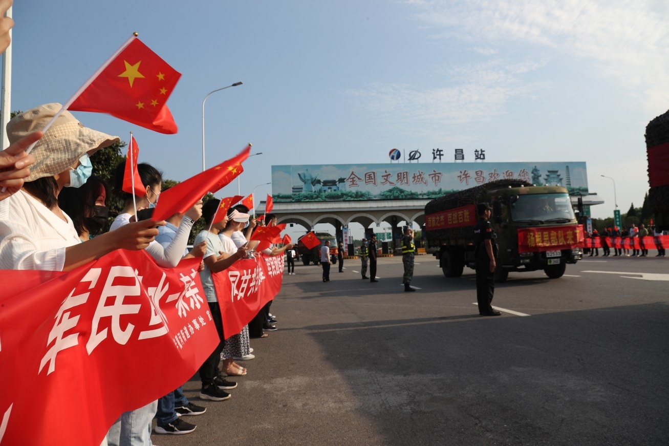 7月30日,市民在京港澳高速公路許昌站出站口列隊(duì)迎接抗洪救災(zāi)歸來的駐許某部官兵。當(dāng)日,駐許某部官兵圓滿完成抗洪救災(zāi)任務(wù)后順利返回。得知抗洪救災(zāi)英雄凱旋,廣大市民自發(fā)來到京港澳高速公路許昌站出站口列隊(duì)迎接。 本報(bào)記者 牛書培 攝