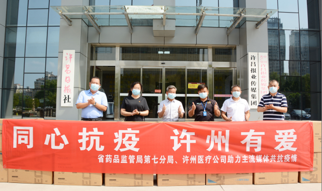 口罩作為重要的疫情防控物資,對于一線工作人員來說必不可少。8月6日,省藥監(jiān)局第七分局聯(lián)合許昌許州醫(yī)療器械有限公司向許昌日報社捐贈口罩2.8萬只,助力一線新聞記者在當前疫情形勢下開展工作。圖為口罩捐贈交接現(xiàn)場。 孫學濤 攝