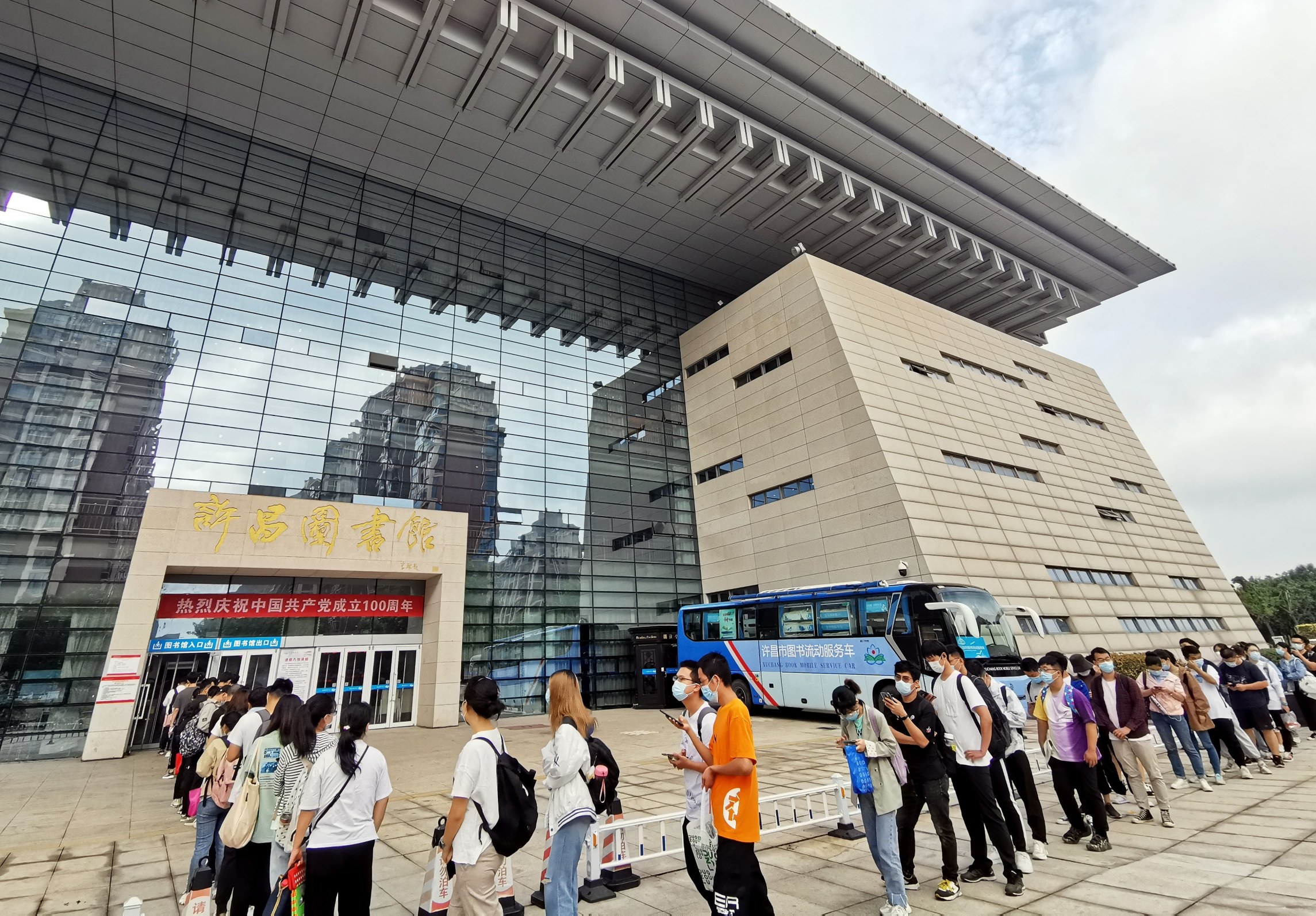 8月28日,許昌市圖書館恢復(fù)開放。入館人員須出示健康碼和行程碼、體溫正常。隨著我市疫情防控常態(tài)化,市民生活逐步回歸正常。圖為市民排隊有序入館和讀者在圖書館自習(xí)區(qū)學(xué)習(xí)。本報記者 喬利峰 攝