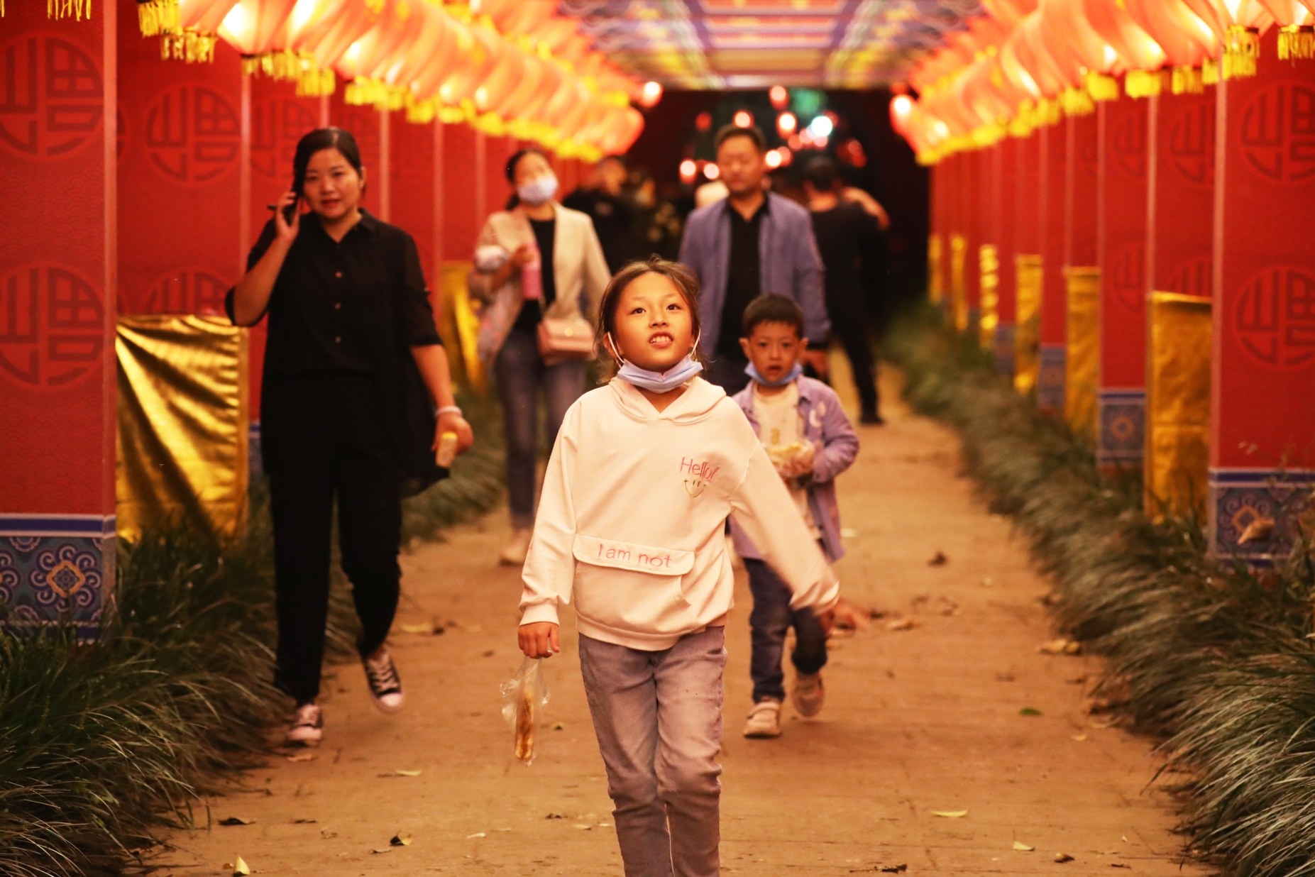 10月3日,市民在灞陵橋景區(qū)賞燈游玩。