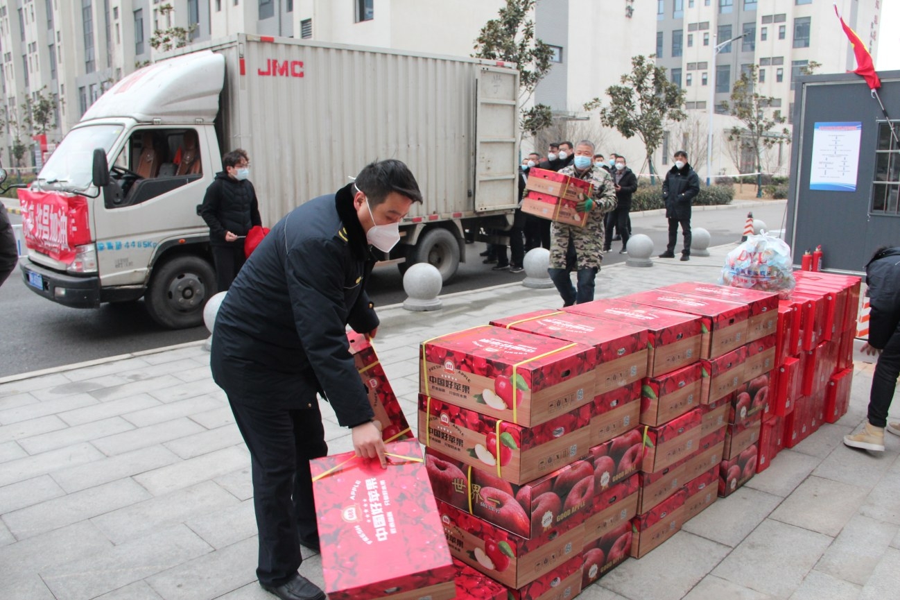 1月14日下午,市政務服務和大數(shù)據(jù)管理局有關負責人帶領市物聯(lián)網(wǎng)協(xié)會會員單位,為萬象春天社區(qū)及東城區(qū)3個集中隔離點送去牛奶、牛肉、蘋果、鹵蛋等價值3萬多元的生活物資,慰問疫情防控一線工作人員。 魏東雅 攝