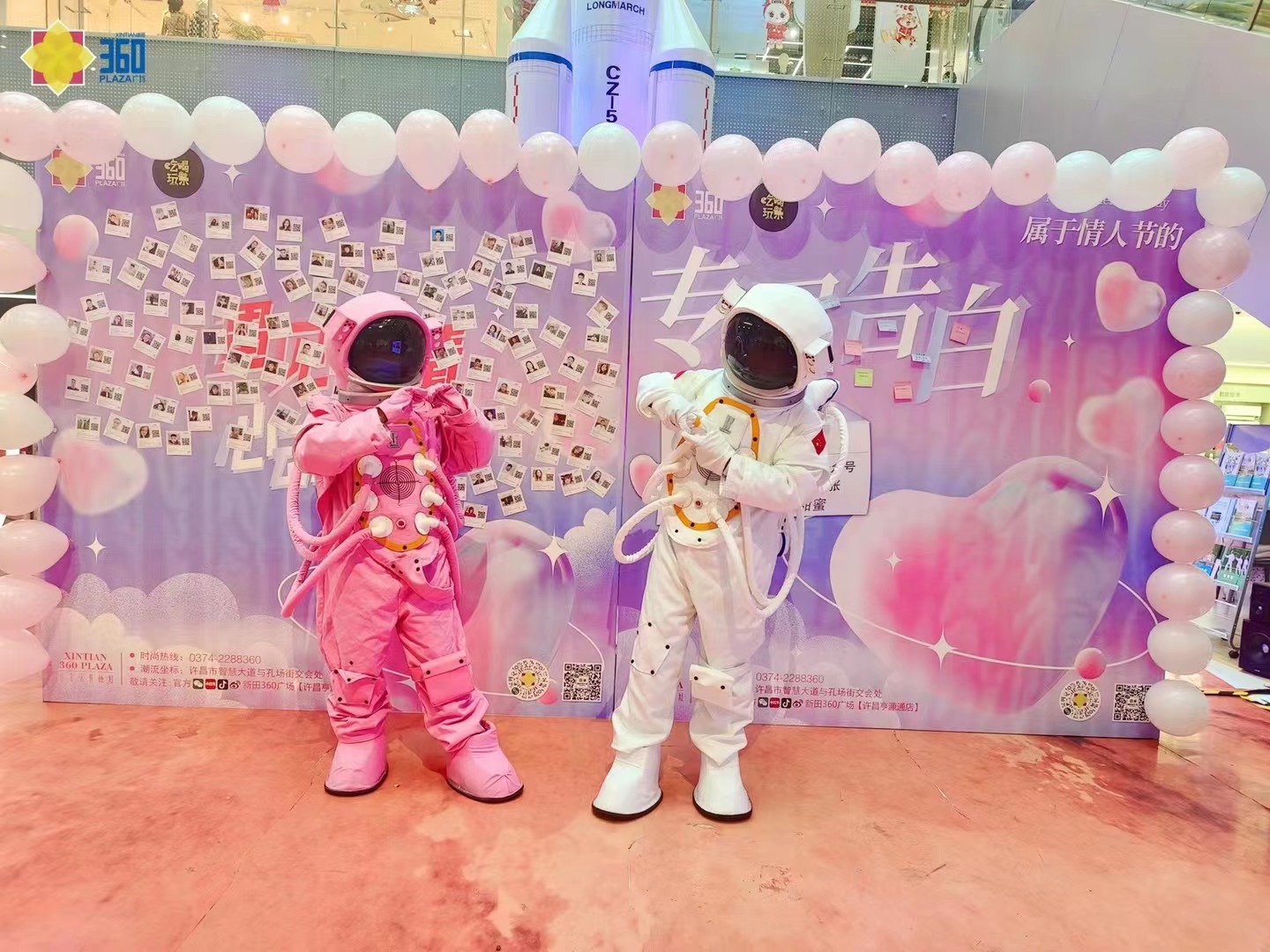 在新田360廣場(chǎng)許昌亨源通店里,有精心布置的展區(qū)空間,與實(shí)物按比例制作的超逼真載人航天火箭,火星車模型,用紅泥模擬火星表面紅土,高清晰的宇宙太空背景……大家在享受非同尋常的“星際遨游”體驗(yàn)的同時(shí),身著航空服的神秘嘉賓和神秘“小姐姐”(如圖)還會(huì)送上鮮花、鉆戒,以及愛意滿滿的求婚告白!