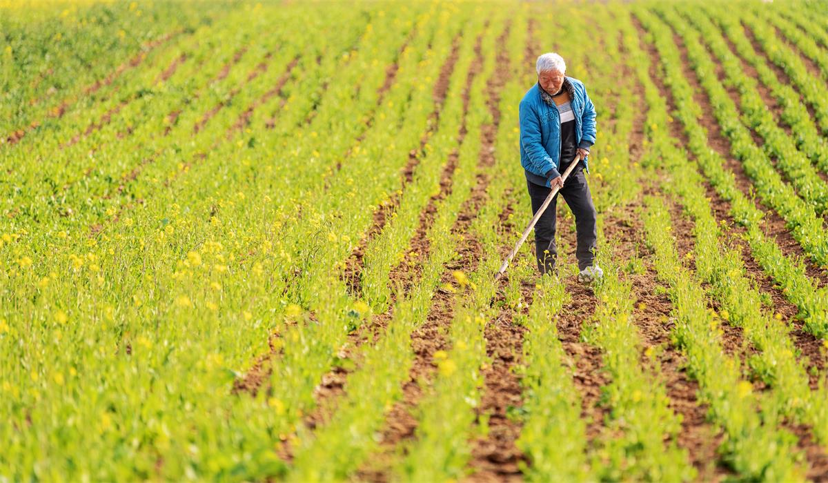 3月15日,襄城縣丁營鄉(xiāng)苗府村村民在油菜田鋤草。仲春時(shí)節(jié),綠苗返青、萬象更新,我市農(nóng)村干部群眾搶抓農(nóng)時(shí),加強(qiáng)春田管理,奠定豐收基礎(chǔ)。簽約攝影師 劉喜芳 攝
