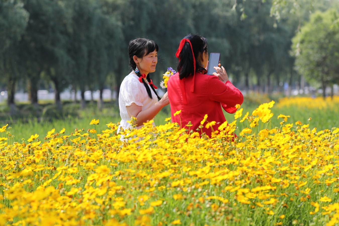 5月26日,市民在學(xué)院河畔賞花游玩。初夏時(shí)節(jié),市區(qū)學(xué)院河畔的硫華菊、金盞菊、波斯菊、格?;ǖ雀黝惢ɑ荜懤m(xù)開(kāi)放,美不勝收,成為市民們休閑游玩的好去處。 記者 牛書(shū)培 攝