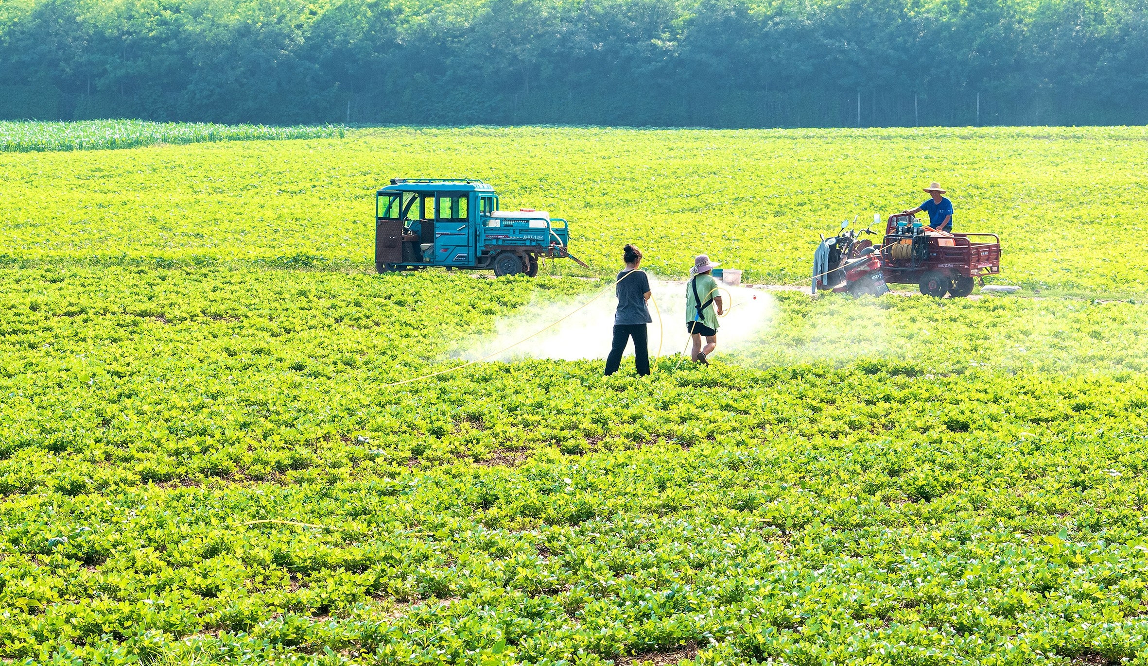 7月7日,襄城縣丁營鄉(xiāng)廟府村村民在為花生噴施葉面肥。小暑時節(jié),雨過天晴,秋苗進(jìn)入旺長期,為穩(wěn)單產(chǎn)、保豐收,該縣號召基層干部群眾,加強(qiáng)田間管理,確保秋糧豐產(chǎn)豐收。 簽約攝影師 劉喜芳 攝